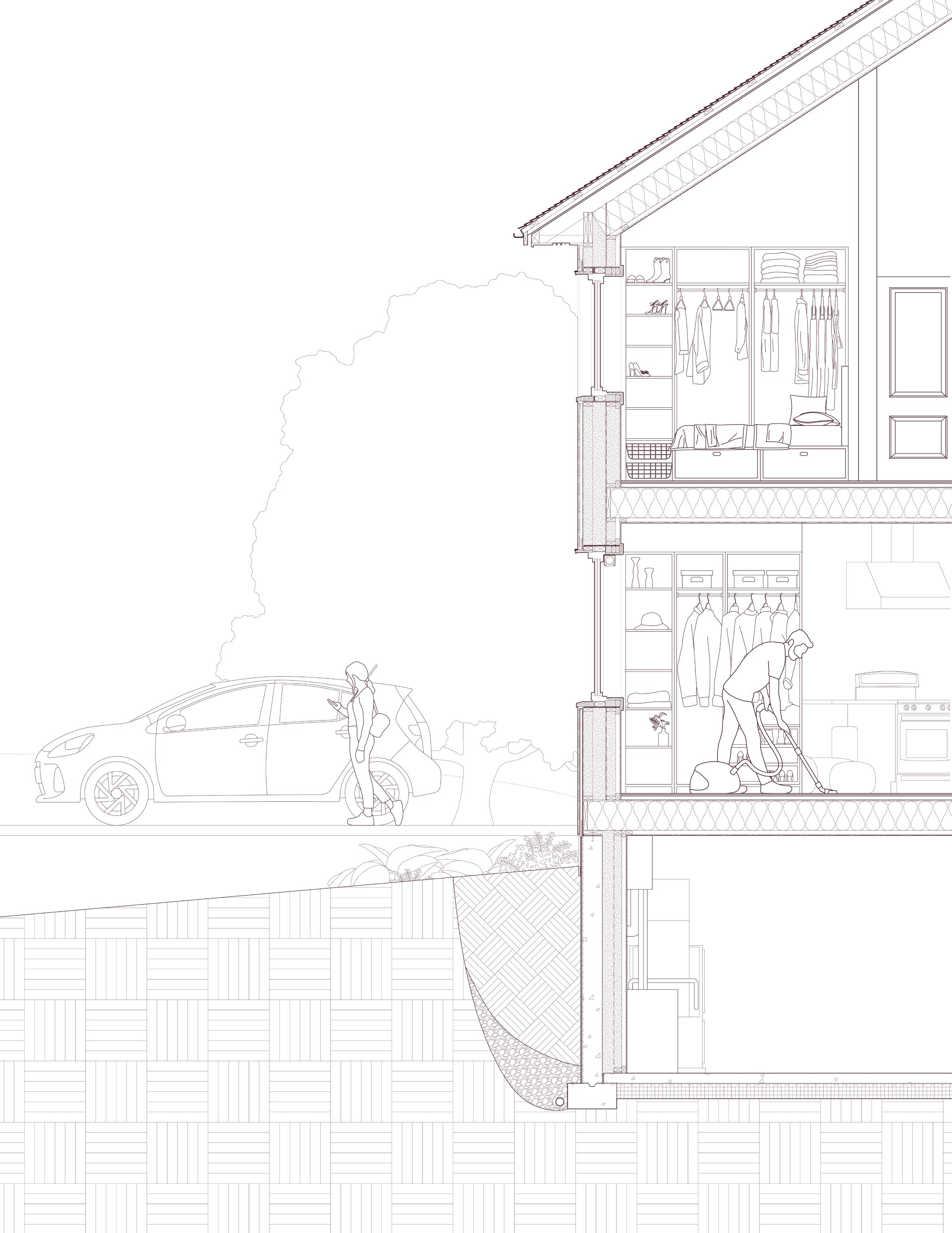 Located in Porvoo, Finland, Keidas is an entirely self-sufficient residence contributing low embodied carbon levels and redefining building systems. Because of Porvoo’s geothermally-potent geography, heating is primarily drawn from underground using copper pipes before distributing through the HVAC systems and radiant heat pipes underneath the floorboards. Electricity is harvested using the photovoltaic panels on the south-sloped roof facade, stored in a portable battery and distributed along the inner walls of the service voids. Rainwater collected using the sloped rain gutter into the outdoor insulated cistern passes through the greywater system before accumulating in the potable water tank while disturbing excess water into the rain garden.
