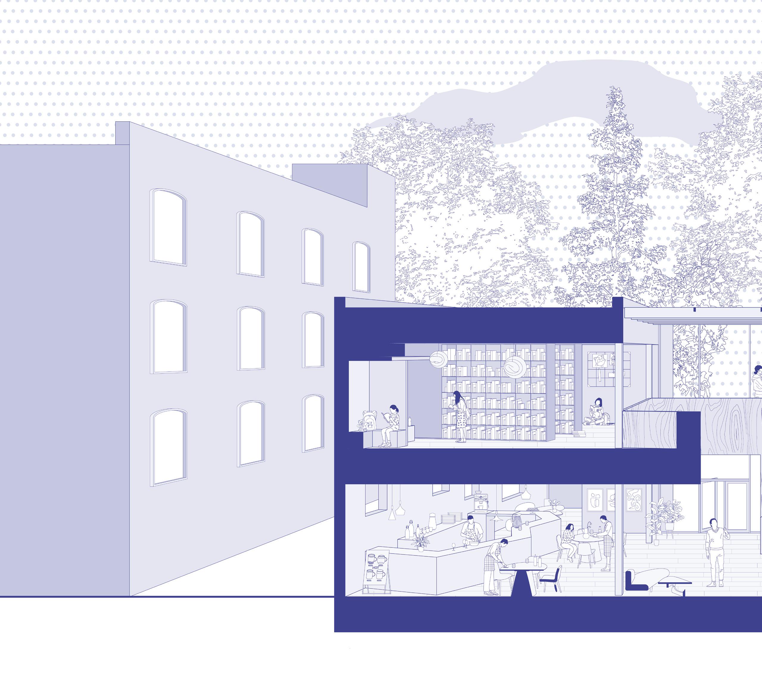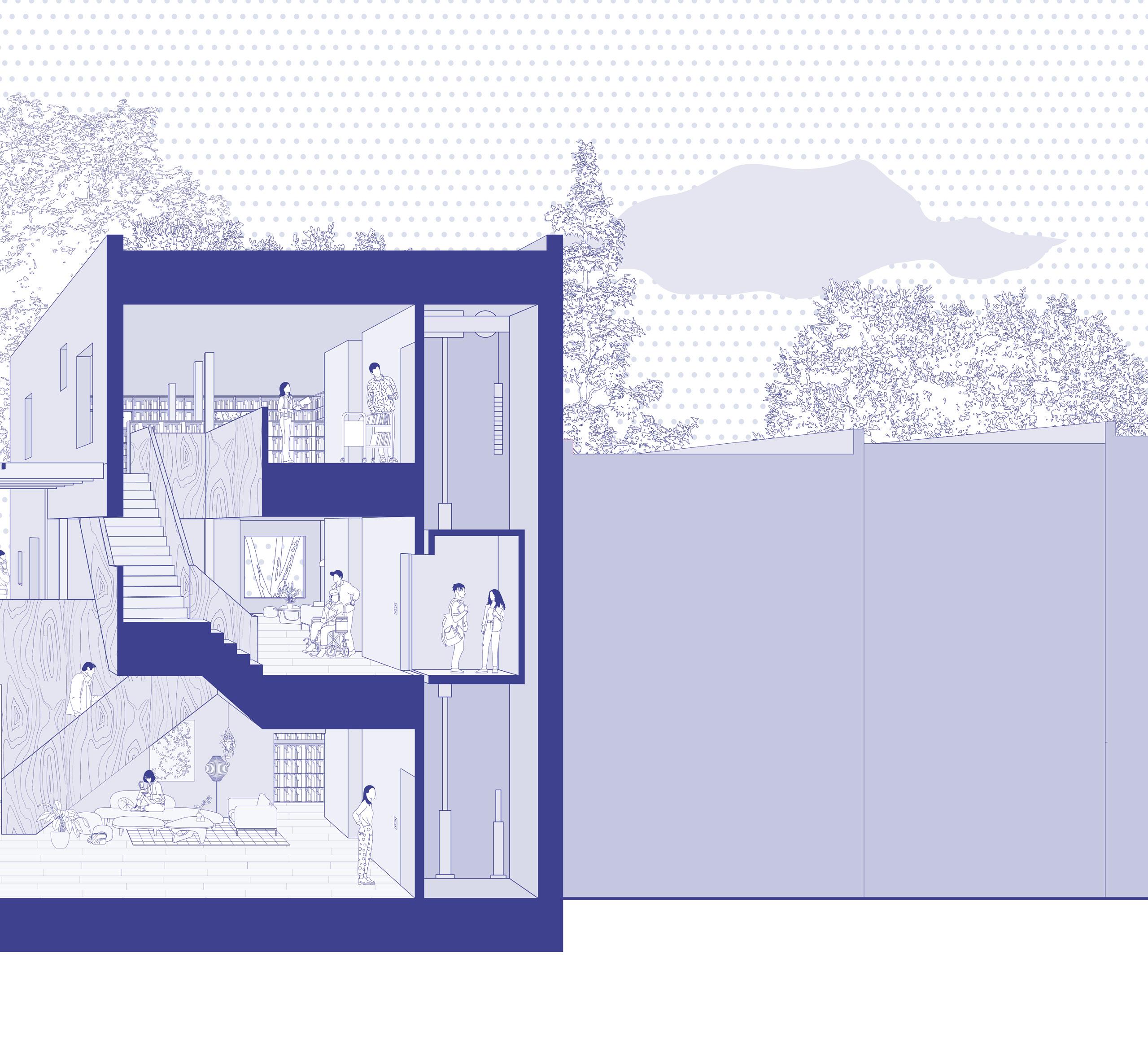 Located in downtown Toronto on Davies Avenue, wedged between two buildings with a road on one side and a community park on the other, Passage serves as a beacon of natural light, providing ample daylighting in needed spaces while prioritizing its occupants’ comfort. A clear hierarchy is established among the floors, with the ground floor primarily public, open to the cafe and stacks where magazines and other forms of media are found, whereas the third floor offers more private seating and viewing spaces.