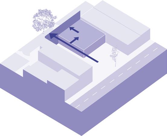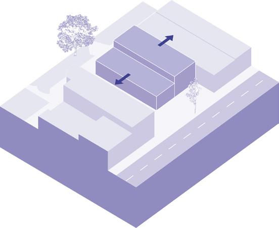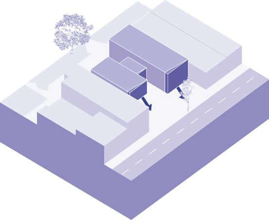 Mass pushed forward and against adjacent building creating a continous flow between the adjcent forms.