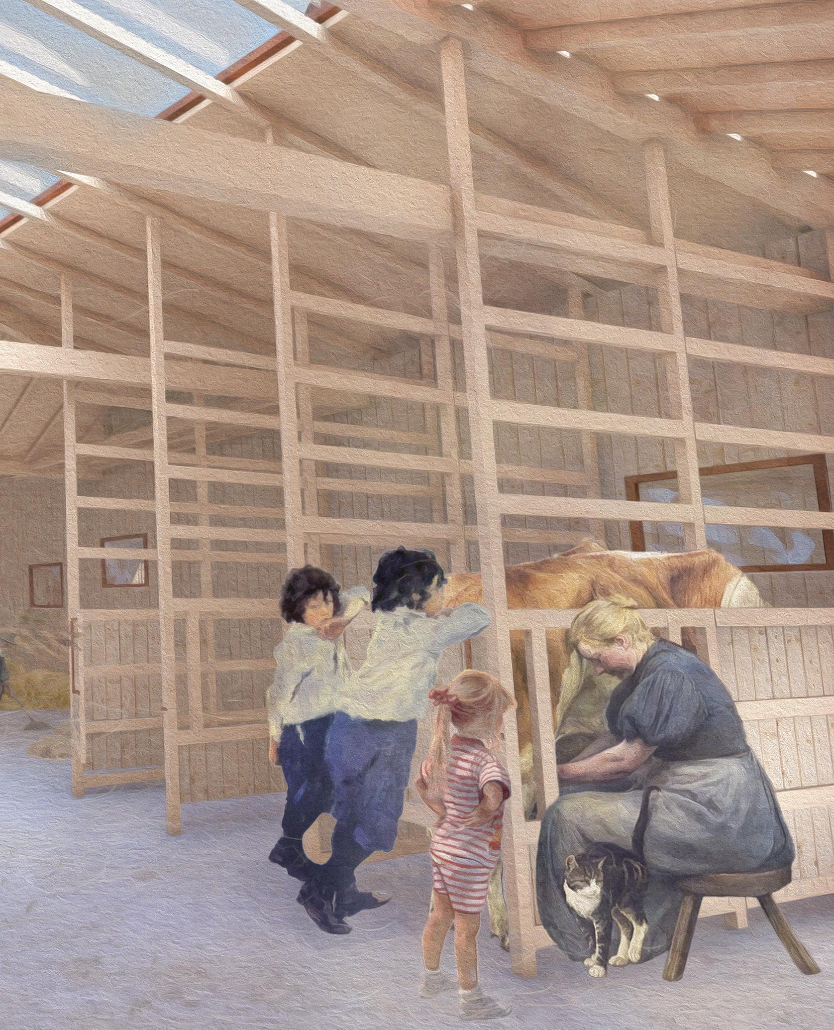 The barn is a key space to integrate a sophisticated ventilation strategy, opting for a mixed-mode ventilation type. This mixed-mode ventilation will improve indoor air quality (preventing VOC and CO2 build-up), improve energy efficiency through the MVHR system, and create greater resilience on site.