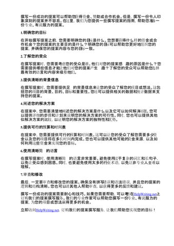 撰写一份成功的提案可以帮助您获得资金、赞助或合作机会。但是,撰写一份令人印 象深刻的提案并不容易。在这里,我们为您提供一些撰写提案的指南,帮助您准备一 份专业、有说服力的提案。