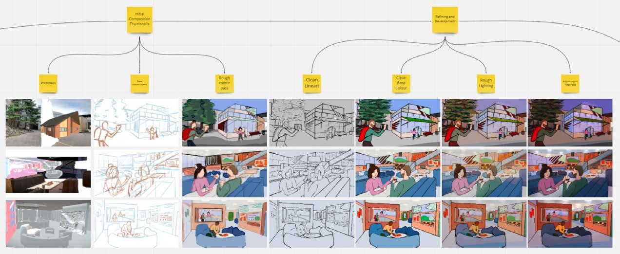 The design process began with cohesive moodboarding as explored in the earlier pages, followed by gathering references from Sketchfab and Google Maps for basic photobashing. From there, basic lineart sketches and flat colours established each composition. Clean lineart followed by clean colours completed the base illustration stage. Finally, atmospheric touches were added with two lighting passes (one for external sunlight and the other for interior lighting), the accompanying shadow passes, and minor adjustment layers.
