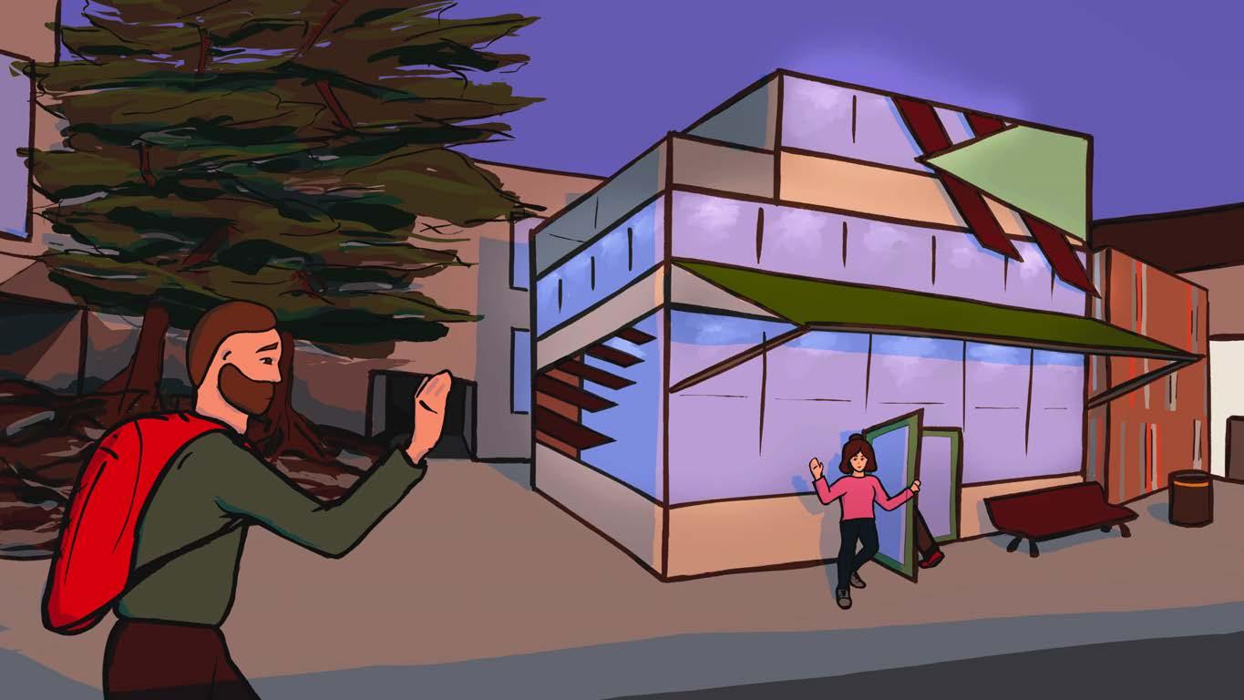 Character context: Peter, an ENU MHS worker, waves hello to a student as he approaches the building.