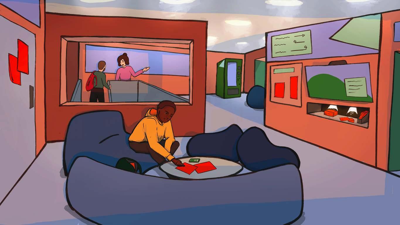 Character context: Michael, a shy student, looks through the easy-to-access MHS information quietly at his own pace, while another student and a MHS worker move towards a breakout room in the background.