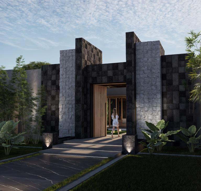 Una vez pasamos el lobby, nos encontramos con las fachadas principales de Villa Bayu. El diseño tropical destaca, aprovechando materiales naturales e integrando un enfoque inteligente que resalta la conexión con la naturaleza.