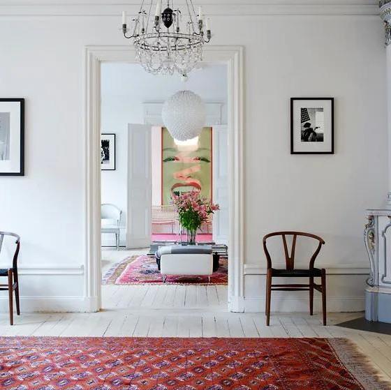 By placing similar style/coloured rugs in connecting spaces, you unify and create a visual connection between the two rooms. This, in turn, makes each room flow from one to the next as your eye is drawn from one space to the next. This works particularly well in neutral and/or minimal spaces.