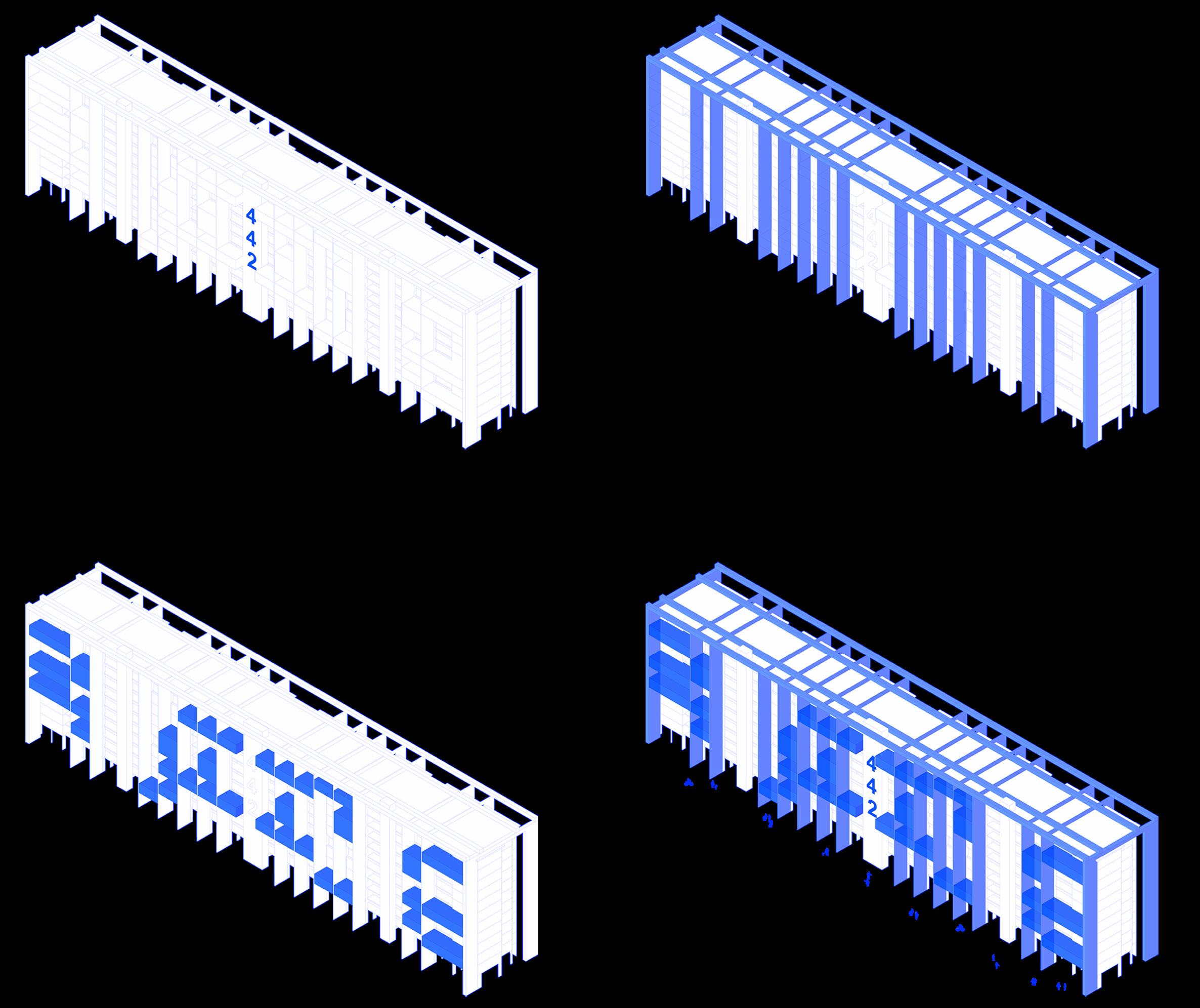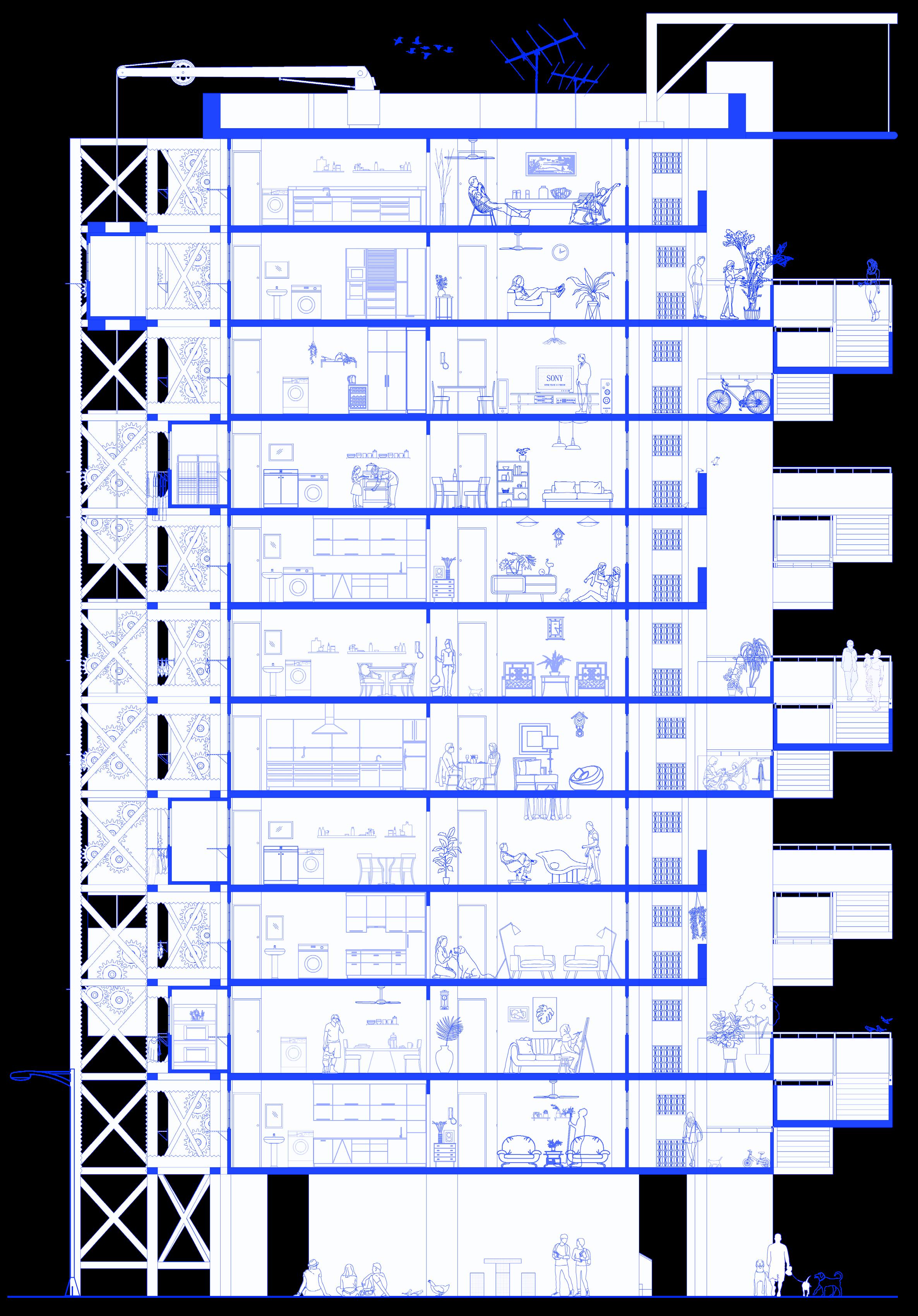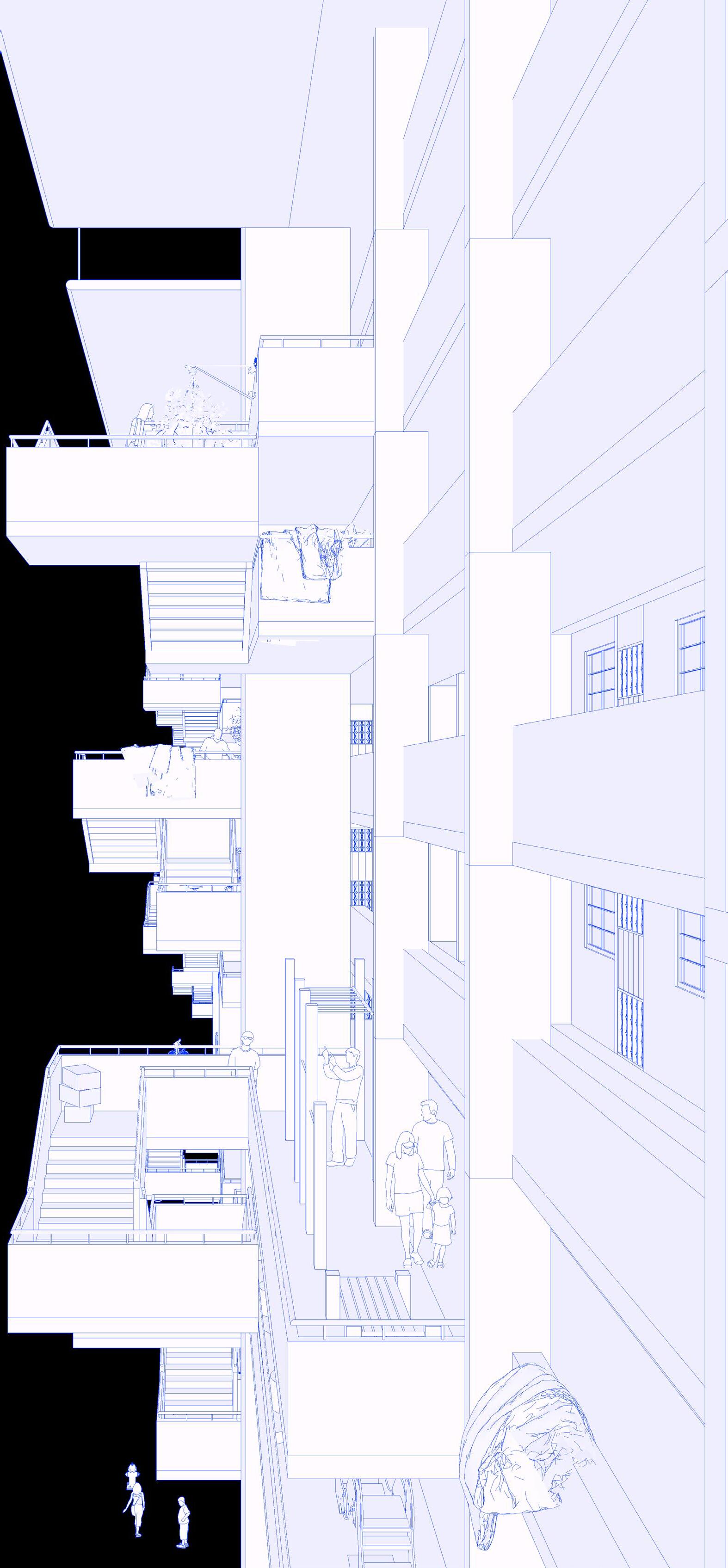 The goal is to design a tectonic system that can grow and adapt to our changing needs. We can adopt plug-and-play strategies by introducing parts that can be attached to and invade the existing slab block. This aims to mitigate spatial needs within the flats and provide spaces that would enhance the accessibility to common spaces.