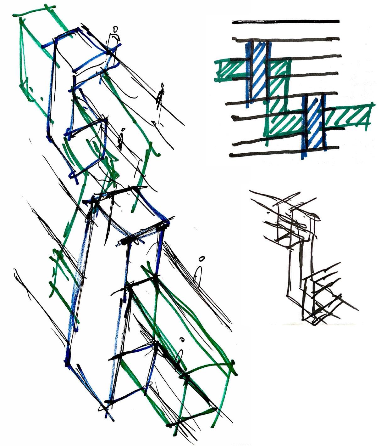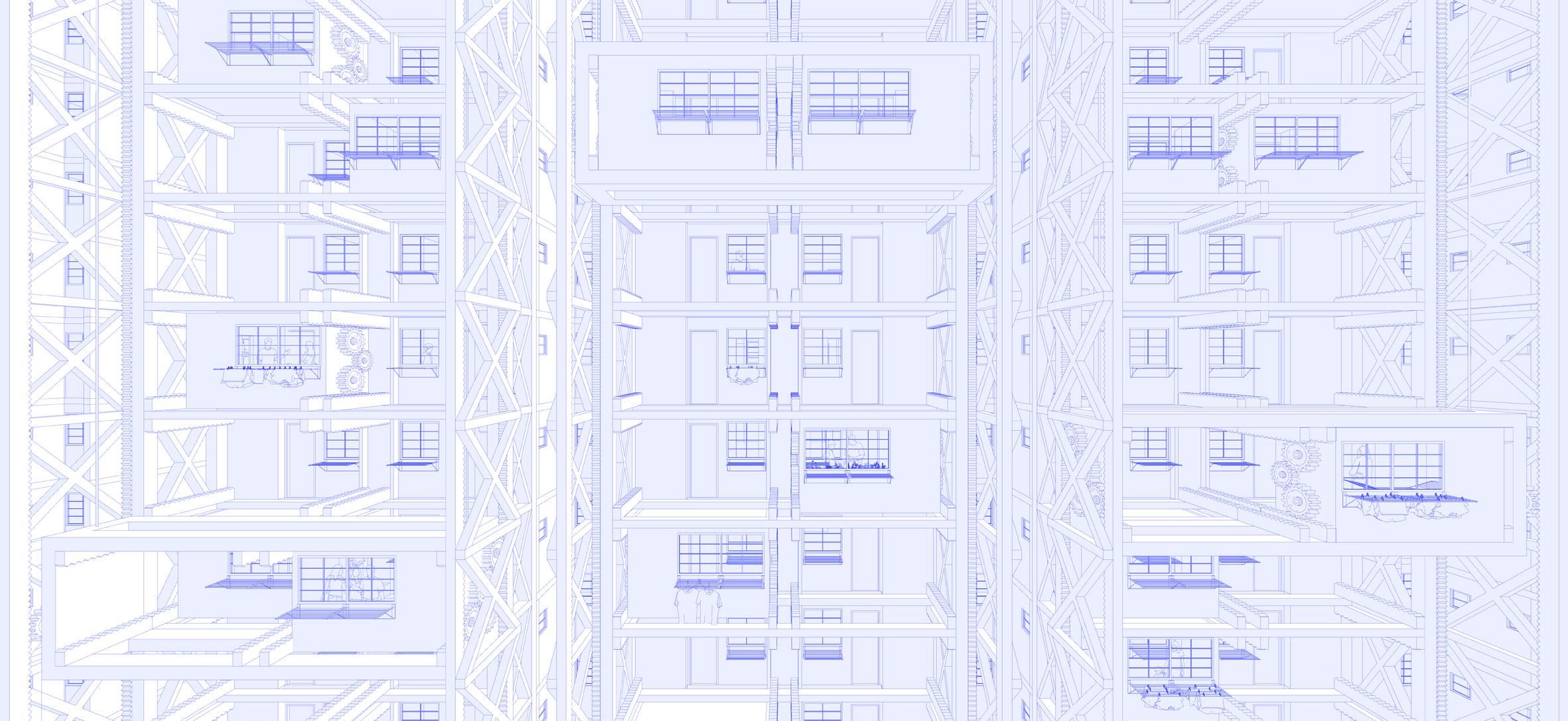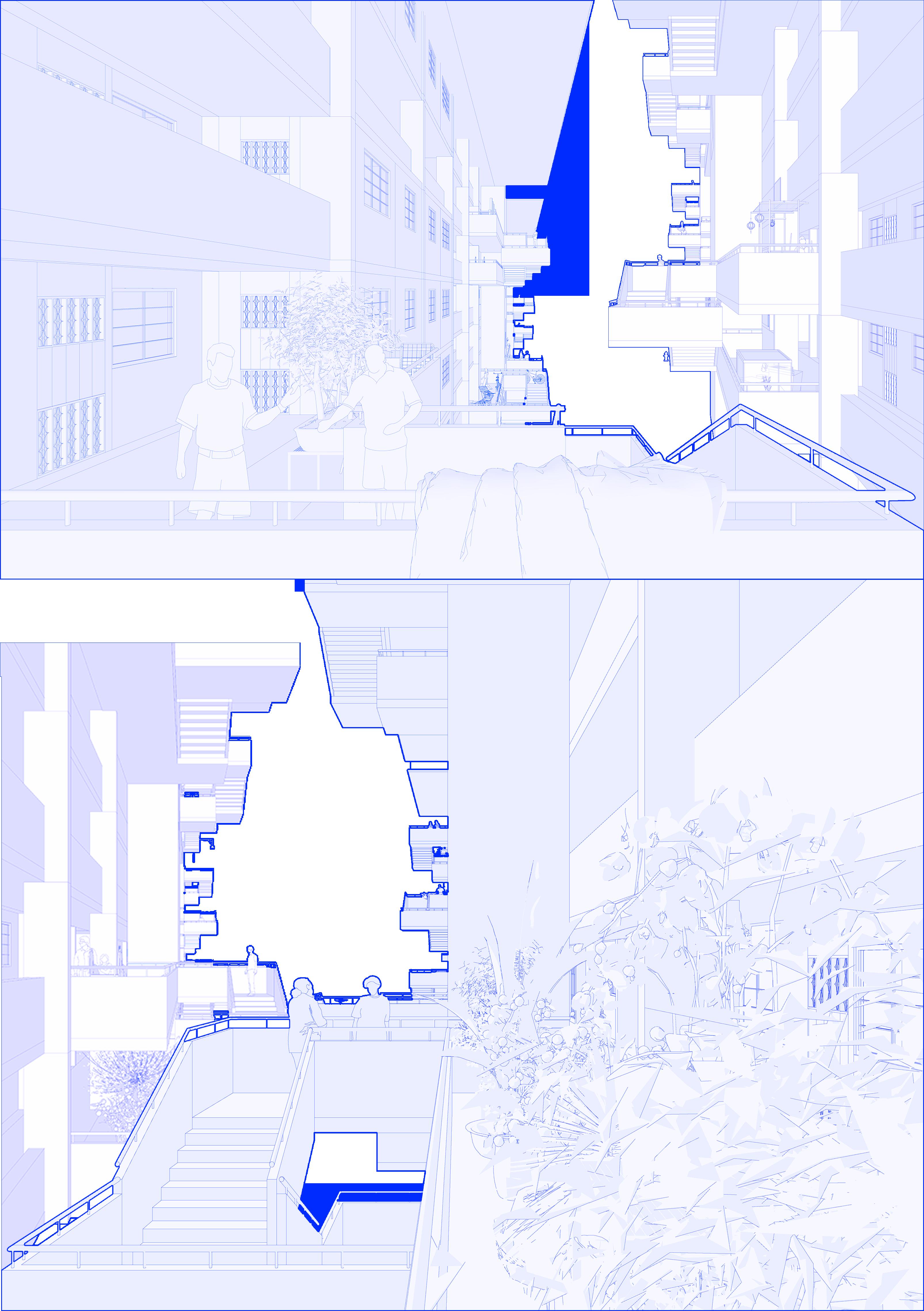 The goal is to design a tectonic system that can grow and adapt to our changing needs. We can adopt plug-and-play strategies by introducing parts that can be attached to and invade the existing slab block. This aims to mitigate spatial needs within the flats and provide spaces that would enhance the accessibility to common spaces.