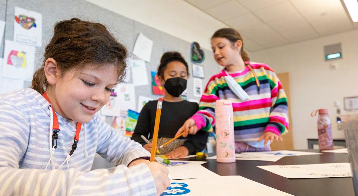 Before they started snipping and sewing, 5th graders in Ashley Ortiz and Jenn Heffernan’s visual arts classes discussed the work of Bisa Butler, who is bridging tradition and contemporary storytelling with her vibrant quilted portraits of Black Americans. The students also learned of a rural community in Alabama called Gee’s Bend, where a decades-old women’s