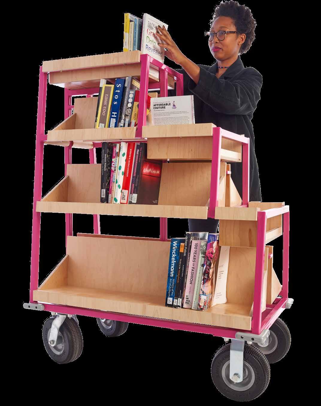 The powder-coated steel frame provides extra weathering wear protection and customization. There was one flaw to the carts, which was their weight after all the books were added to them. The cumulative weight made pushing the cart a bit of a workout.