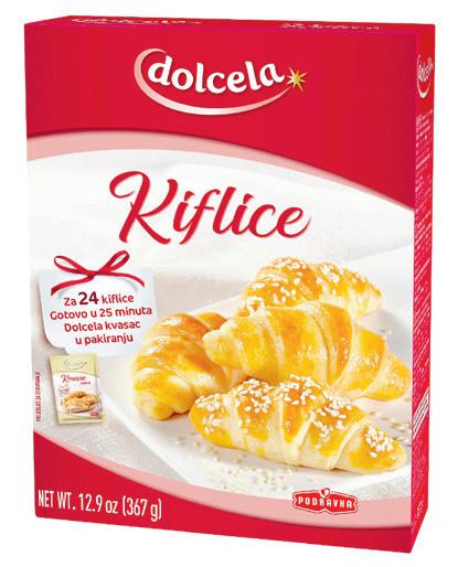 Priprema dizanog tijesta više nije samo za one najhrabrije. S Dolcela Kiflicama priprema je brza i jednostavna, za svega 25 minuta. Pakiranje sadrži i Dolcela instant kvasac 7 g i potrebno je dodati samo ulje i vodu. Prazne ili punjene, sa slanim ili slatkim nadjevom, Dolcela Kiflice izvor su mnogih kreativnih ideja koje će uspjeti baš uvijek! Mješavina je dostatna za izradu 24 mekanih, mirisnih i sočnih kiflica.