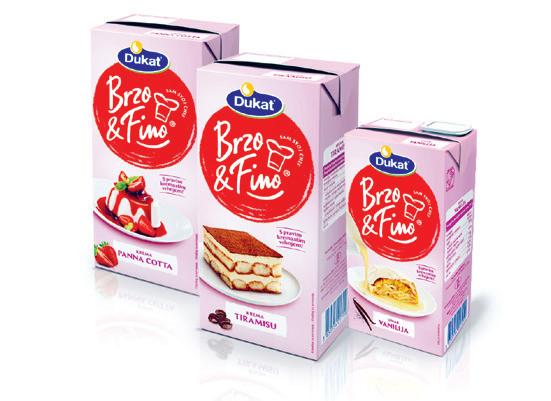 Dukat na hrvatsko tržište donosi gotove kreme s vrhnjem u tri jedinstvena okusa: Panna cotta, Tiramisu i umak od vanilije. Zahvaljujući kremastoj teksturi i bogatom okusu slatkog vrhnja Brzo & Fino krema Panna cotta i Brzo & Fino krema Tiramisu pretvaraju se u popularne slastice u tri jednostavna i brza korake i svega pet minuta. Zbog svoje teksture i bogate arome vanilije, saveznik za pripremu vrhunskih slastica je i Brzo & Fino umak od vanilije. Njime možete vašem desertu dodati kremastost tako da ga samo prelijete preko torte, kolača, a može se koristiti i kao hladan ili topao preljev za štrudle, knedle, voćne salate, sladolede i ostale slastice. Umak se može koristiti hladan, direktno iz pakiranja, ili lagano ugrijan. Brzo & Fino desertne kreme Panna cotta i Tiramisu dostupne su na policama trgovina u pakiranju od 1 kg, dok umak od vanilije dolazi u pakiranju od 500 g, a možete ih pronaći i na www.dukatshop.hr.