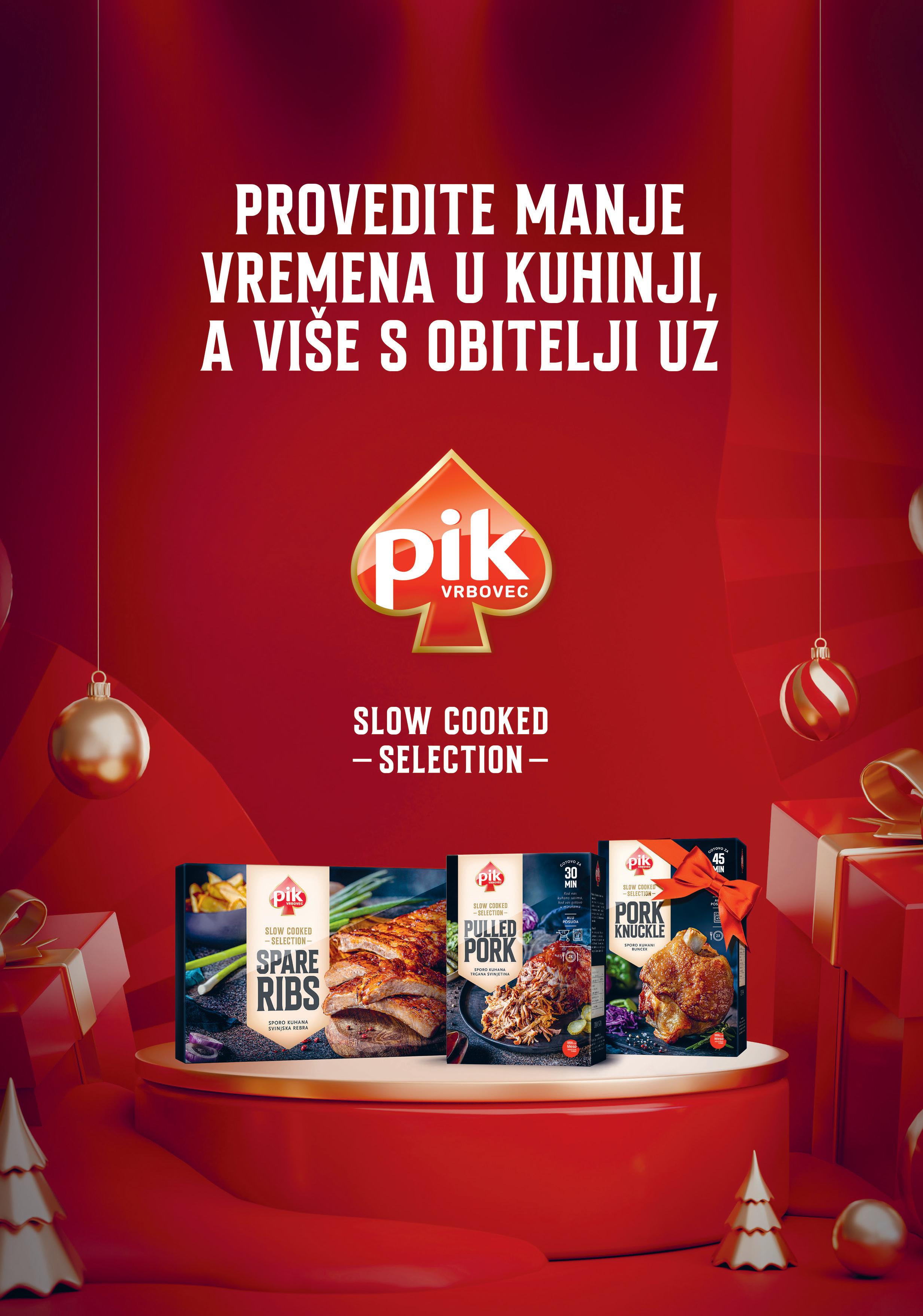 PIK VRBOVEC ovog prosinca, mjeseca obilježenog blagdanskim druženjima s obitelji i prijateljima, tržištu predstavlja novu liniju proizvoda polugotovih mesnih jela – PIK SLOW COOKED SELECTION. Svi proizvodi termički su predpripremljeni slow cooking metodom i potrebno ih je samo kratko termički obraditi. Novu liniju čine proizvodi PULLED PORK/TRGANA SVINJETINA, SPARE RIBS/SVINJSKA REBARCA i PORK KNUCKLE/BUNCEK.
