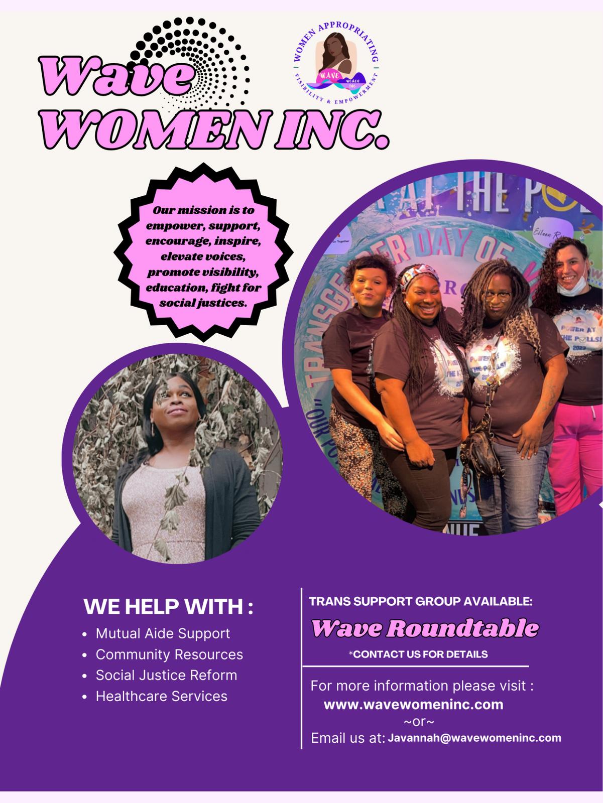 W.A.V.E (Women Appropriating Visibility & Empowerment) is an affirming and safe space organization for black and brown women of TRANSGENDER experience. They strive to connect with other women of Trans experience to provide resources, support, and to build trust, share stories, advice, hope, encouragement, and discuss topics that affect us on a daily basis.