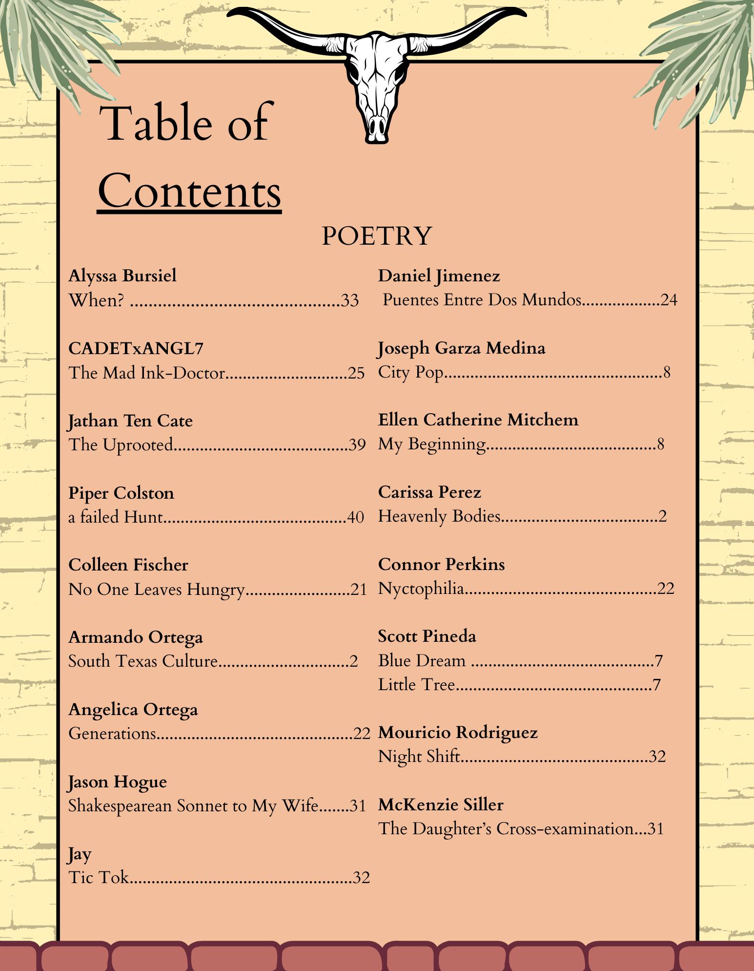 This magazine wouldn’t be possible without the support and encouragement of many. Particularly, we are grateful to Dr. James Palmer, Provost and Senior Vice President for Academic Affairs, for making it possible for us to bring this issue to you. Dr. Palmer also vigorously supported the creative writing and artwork competition with local high schools that has resulted in the robust representation of our young peers of South Texas in this magazine. Thank you, Dr. Palmer, for sharing our vision and encouraging our growth.