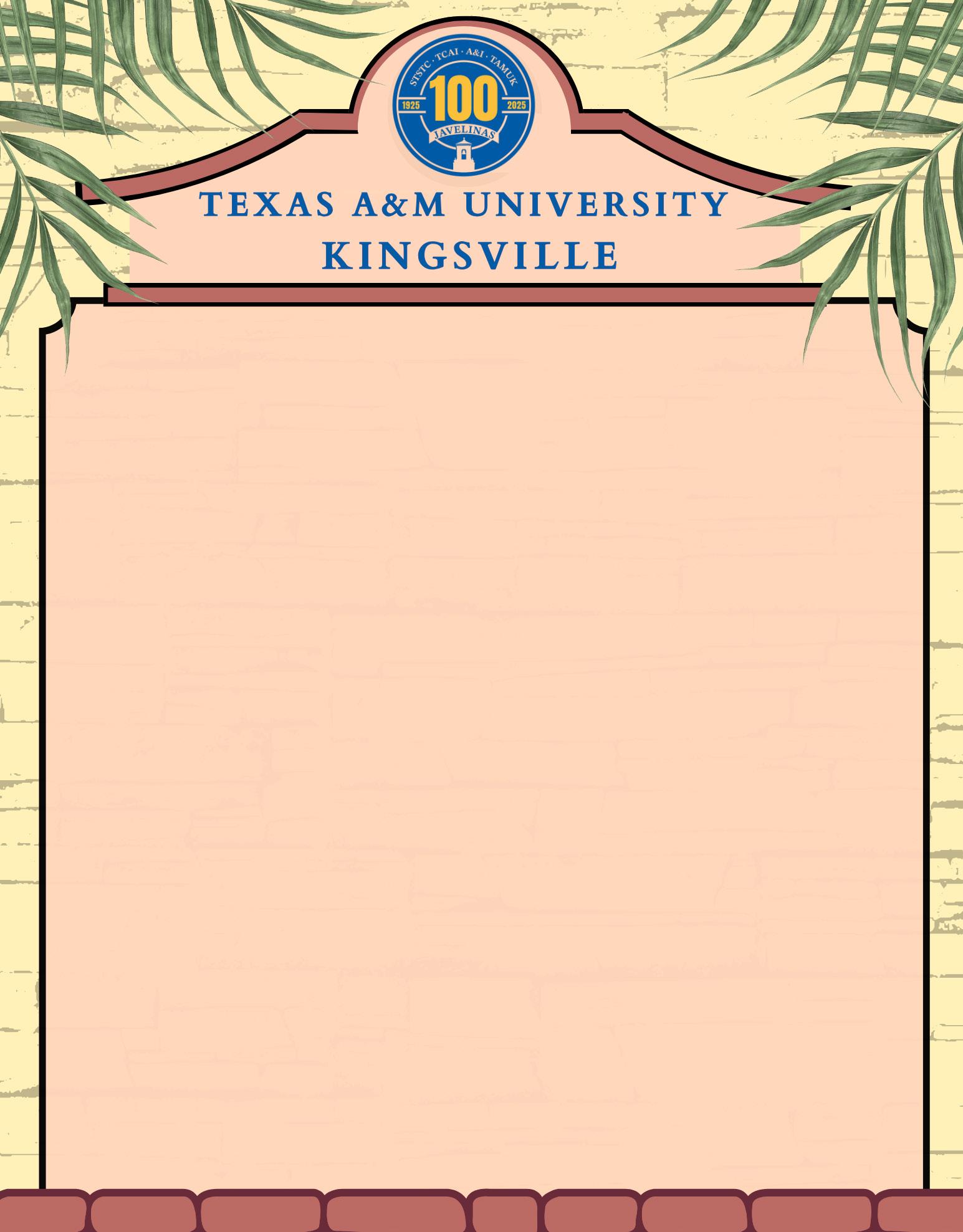 Now we present to you Issue 4 celebrating 100 years of Texas A&M University-Kingsville by showcasing the imagination, the talent, and the passion that our students, staff, faculty, and alumni put into their remarkable creations. And as is fitting—since TAMUK has always served its community since the day it was founded—this issue includes creative writing and artwork from students from 5 local high schools who will hopefully be Javelinas in the near future.