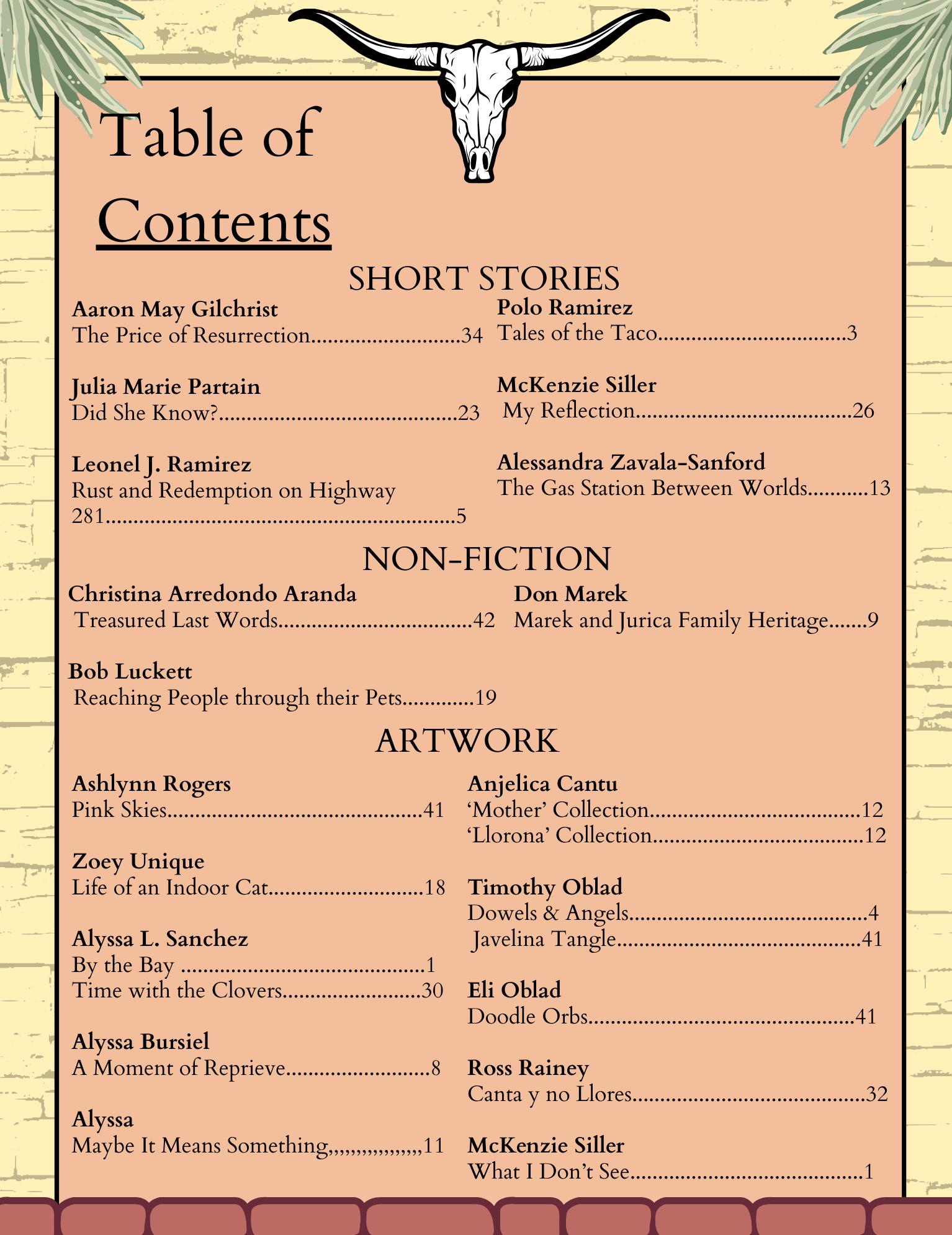 We continue to be grateful to Dr. Roberto Vela Córdova and the Department of Language and Literature. Dr. Vela Córdova has championed the magazine from its inception. He is always in the background smoothing over wrinkles and helping us overcome any challenges that may come our way.