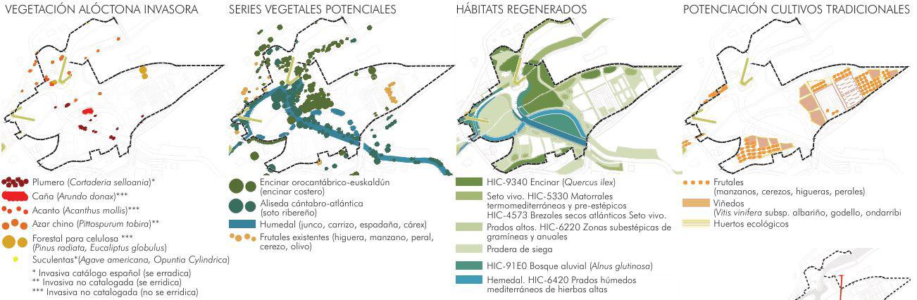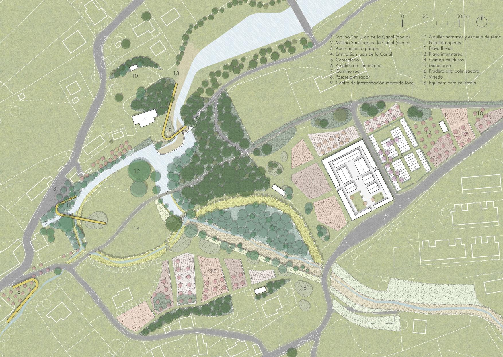 The San Juan Mill Park and its surroundings clearly reflect the histor y of the place. The course of time is evident through three distinct elements that coexist within the intervention area: Water; Productive and cultural landscape; Built, industrial, and religious heritage. The architectural intervention aims to highlight these remnants of the past, its history and the traditional way of life of Bezana´s people. Likewise, the landscape design seeks to strengthen the environmental values of the habitat and tradicional farming integrating them into the territory.