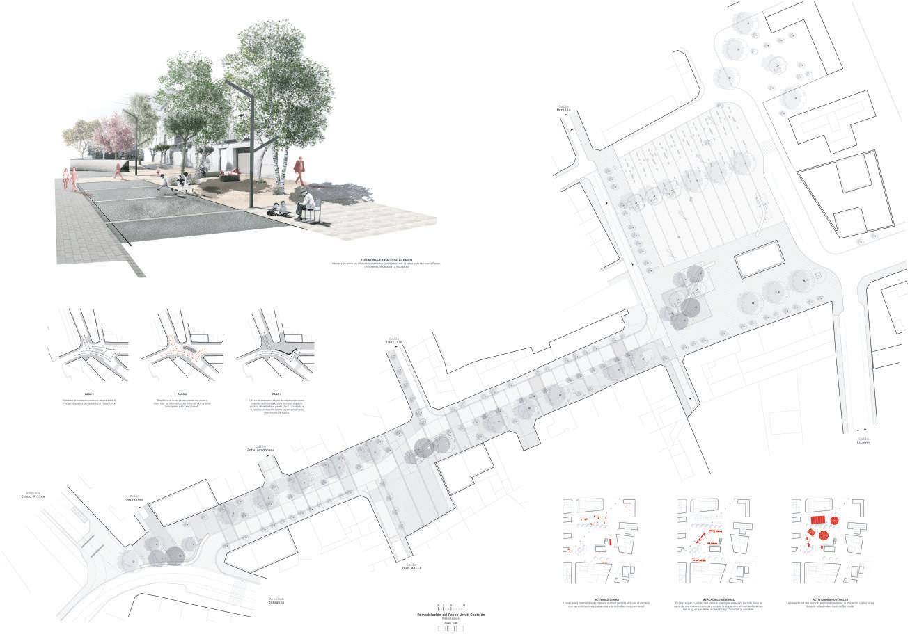 El concurso busca la regeneración de tres plazas que contienen varios elementos públicos de uso diario, pero a su vez, actividades puntuales. La propuesta se presenta como un sistema abierto, que dote diairamente de una comodidad de los grandes vacíos urbanos y permita eventos como mercadillos y actos festivos.