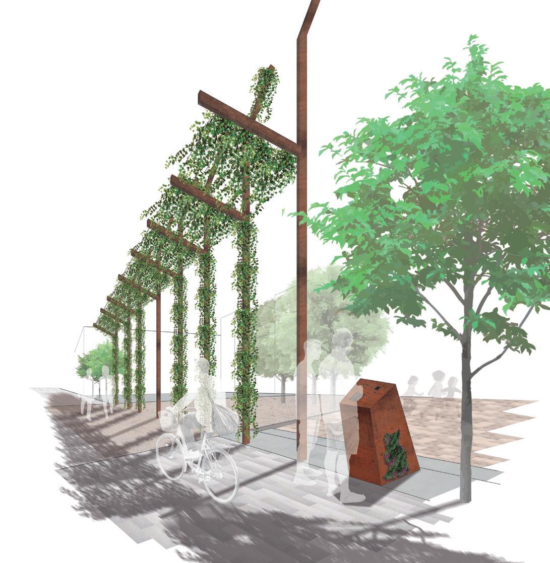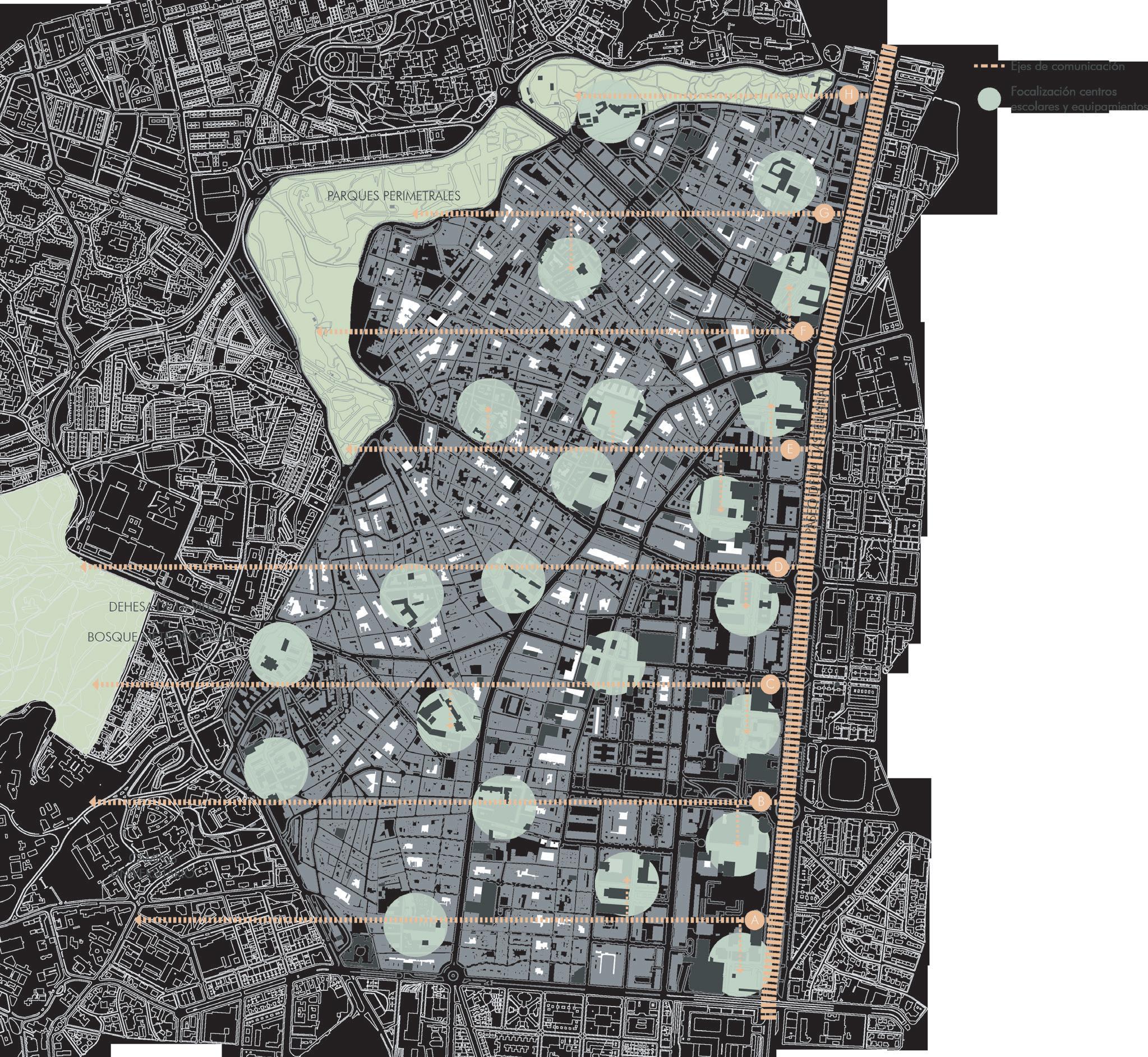 Estrategia urbana para mejorar la sostenibilidad del distrito a través de ejes verdes que enlacen las zonas más comerciales con las grandes áreas verdes de la periferia (Bosque Metropolitano).
