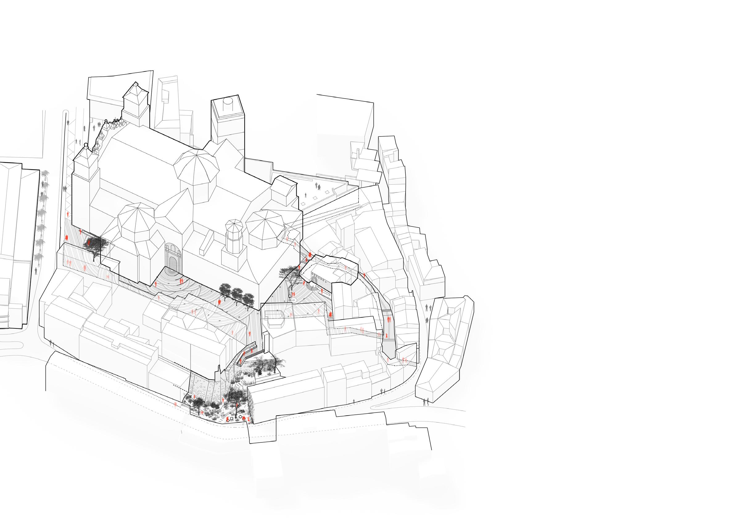 The competition includes the surrounding area of the impressive cathedral and medieval walls ruins that it must be brought to light. The proposal tries to link, in a sensorial way, the different spaces through pavement, local vegetation and water´s sound. The intervention seeks being as discreet as possible to bring to light the history hold in that place.
