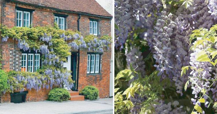 Glicinia. Trepadora con subestructura metálica para no dañar la construcción