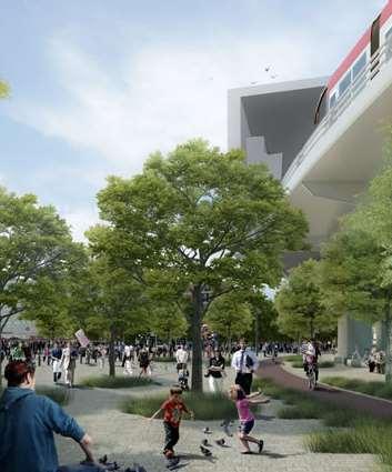 La imagen 115 muestra la perspectiva en el cruce de las calles Av. Juan Pablo II y la calle 20 de Noviembre mostrando como se vería el proyecto volumetricamente. Esta perspectiva muestra como se vería el proyecto si los visitantes vinieran desde la línea 03 desde la estación de Zapopan Centro.