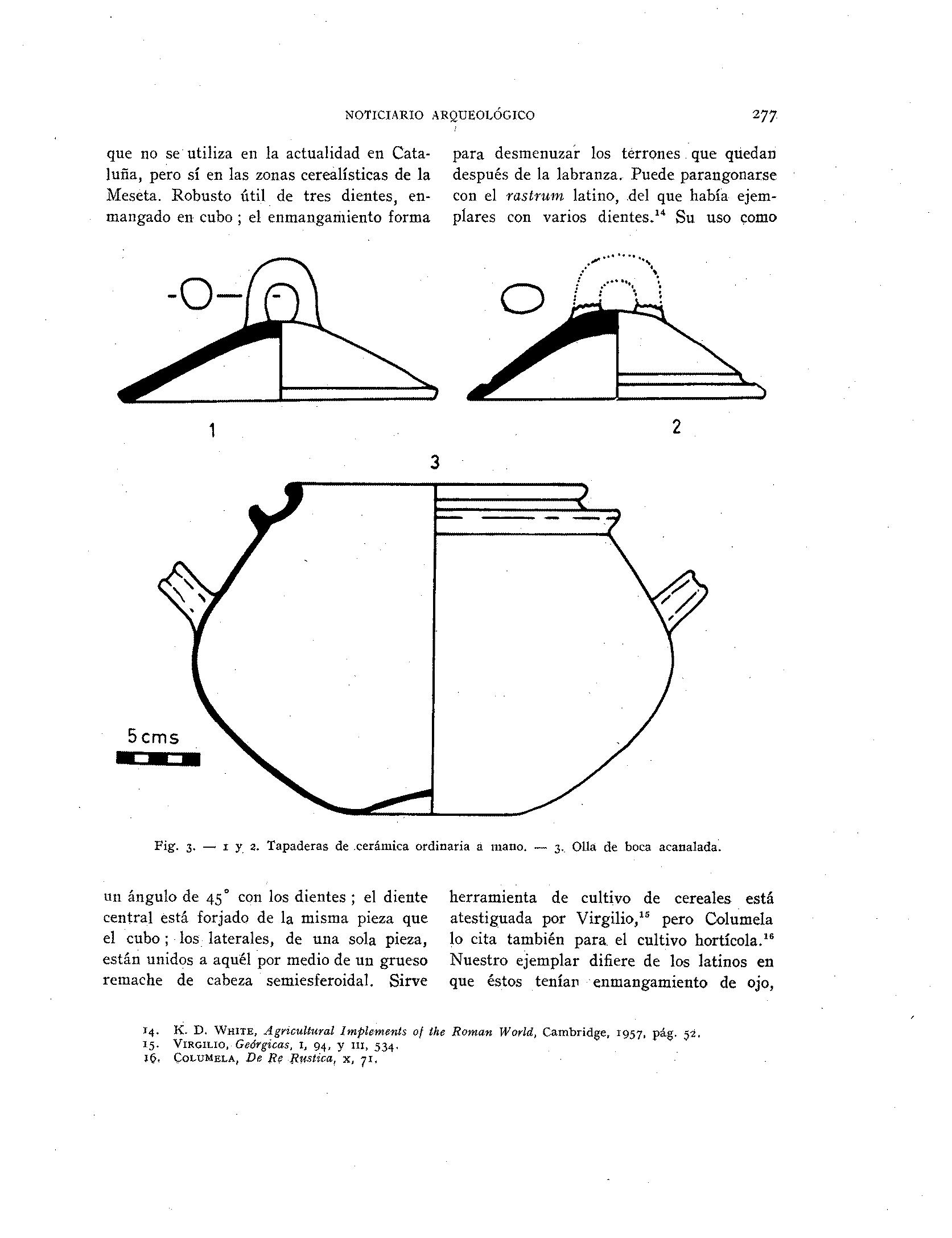Fig. 3. - r y z. Tapaderas de cerámica ordinaria a 111ana. - 3. Olla de boca acanalada iii~ángulo de 45" con los dientes ; el diente herramienta de cultivo de cereales está central está forjado de la misma pieza que atestiguada por Virgilio,l5 pero Columela el cubo ; los laterales, de una sola pieza, lo cita también para el cultivo hortí~ola.'~ están unidos a aquél por medio de un grueso Nuestro ejemplar difiere de los latinos en remache de cabeza semiesferoidal. Sirve que éstos tenían enmangamiento de ojo,