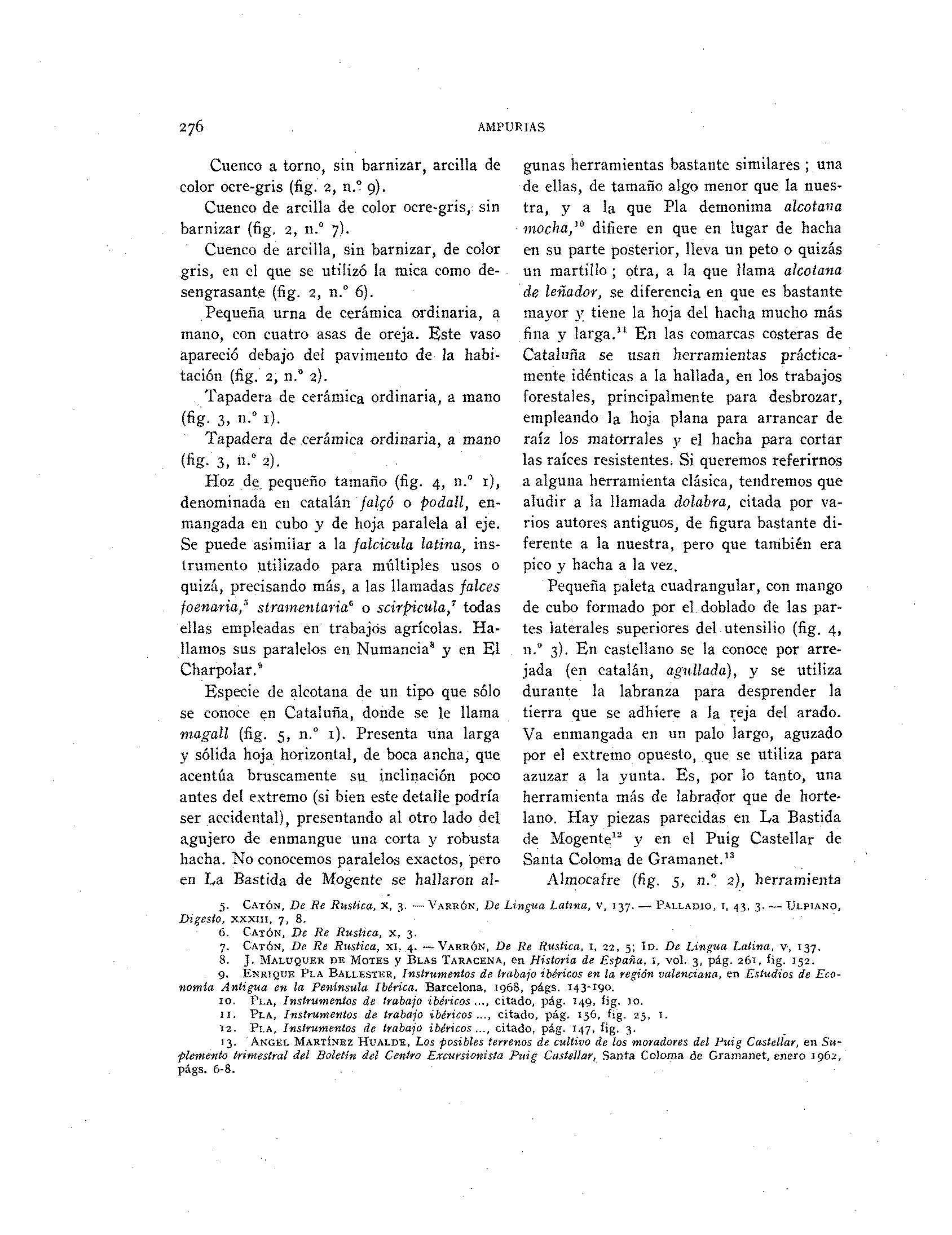 Hoz de pequeño tamaño (fig. 4, n.' I), denominada en catalán {algó o podatl, enmangada en cubo y de hoja paralela al eje. Se puede asimilar a la falcicirla latina, instrumento utilizado para múltiples usos o quizá, precisando más, a las llamadas falces foenaria,%tralnentarias o scirpicula,' todas ellas empleadas en trabajos agrícolas. Hallamos sus paralelos cn Numanciaa y en El Charpolar.'
