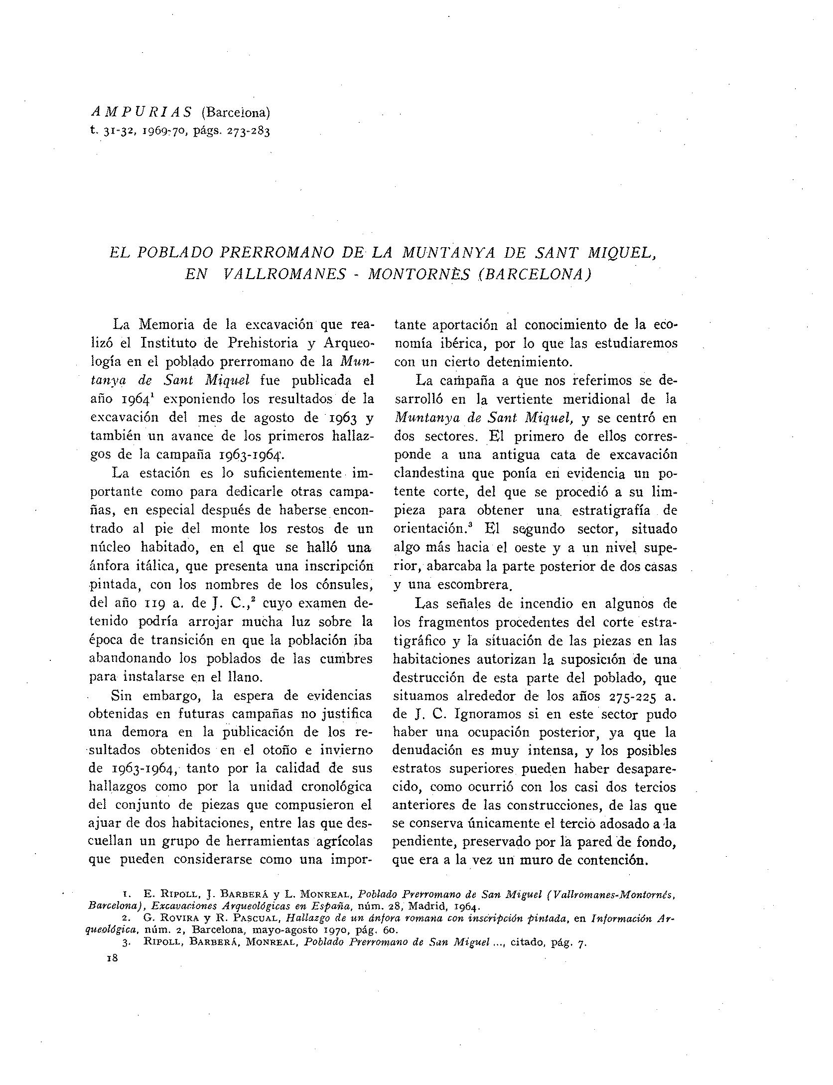 1. E. RIPOLL.J. FJARBERA y L. MOXREAL,Poblado Prerromano de San Miguel (Vallromones-MontornCs, Barrelona), Ercavaciones Arqueoldgicas en Espalia, núm. 28, Madrid, 1964.