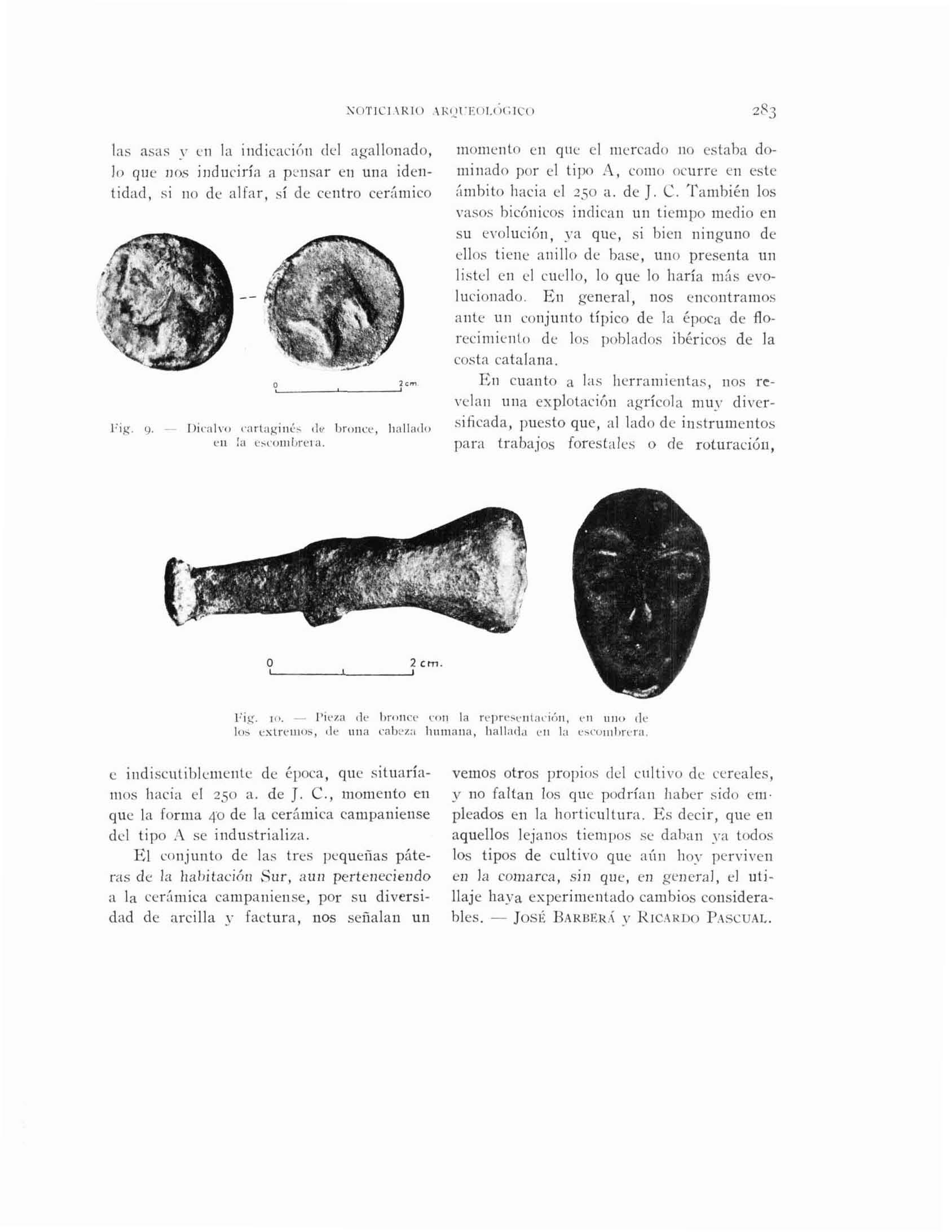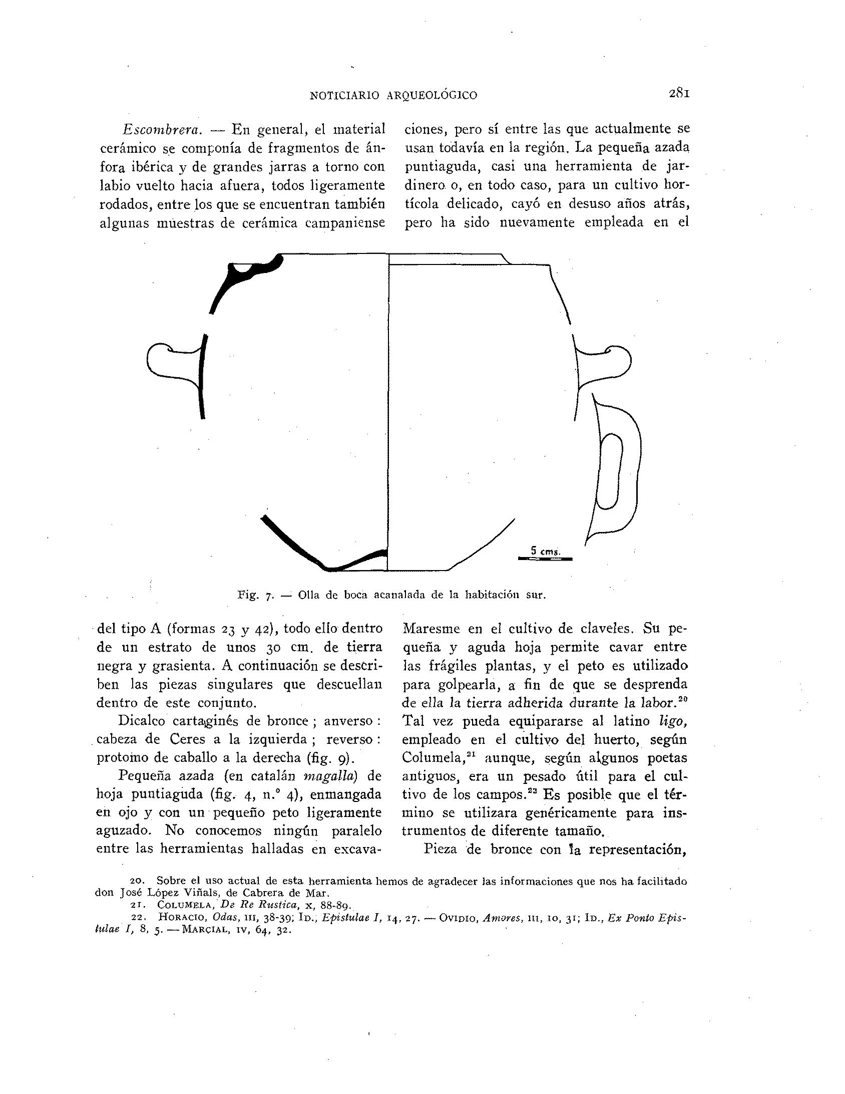 La estacióu es lo suficientemente imp0rtant.e como para dedicarle otras campañas, en especial después de haberse encontrado al pie del monte los restos de un núcleo habitado, en el que se halló una ánfora itálica, que presenta una inscripción pii~tada,coi1 los nombres de los cónsules, del año 119 a. de J. C.,' cuyo examen detenido podría arrojar mucha luz sobre la época de transición en que la población iba abaudonando los poblados de las cumbres para iiistalarse en el llano.