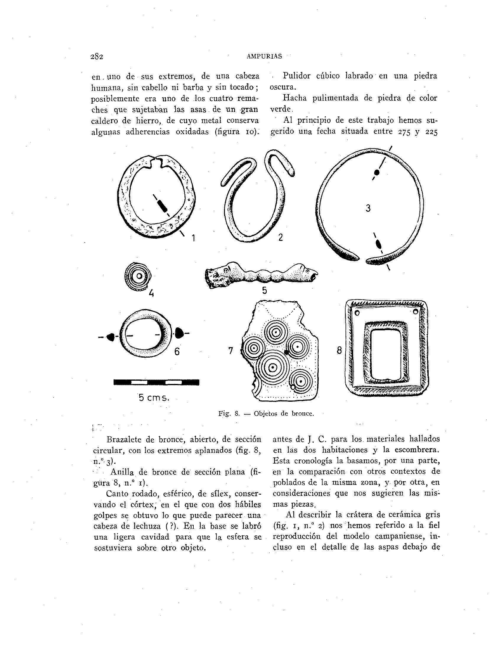 1,lave dc hierro (fig. 4, n.' 7). bronce, perforado y decorado (fig. 8, núHoja y espiga de un pequeiio cucliillo mero 4). de hierro (fig. 4, n.' 5).