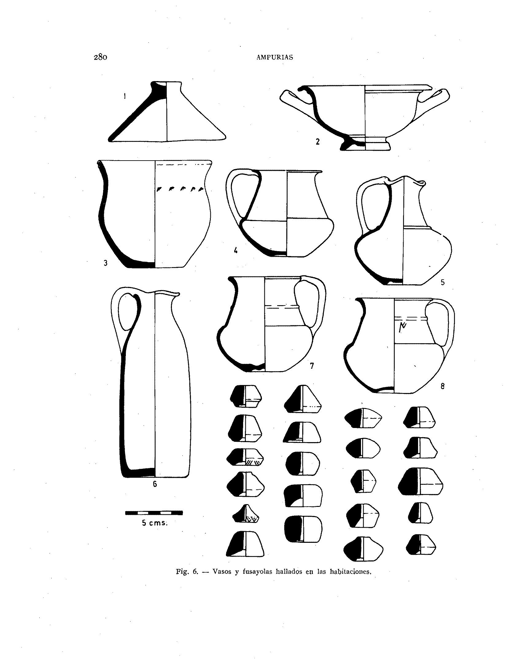 Fig. 6. - Vasos y fusayoias hallados en las habilacioiies.