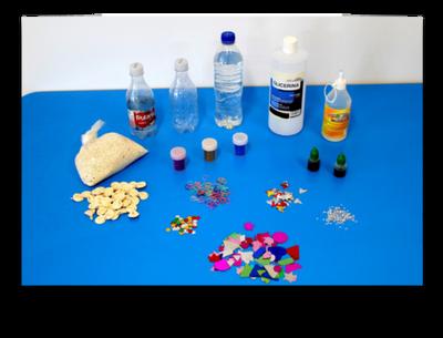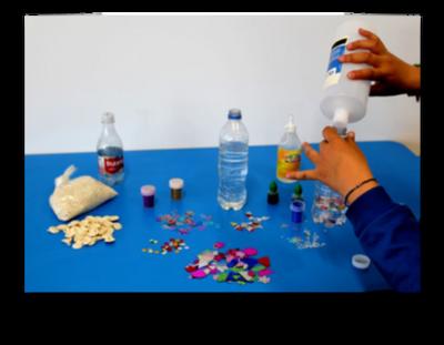 2.- Colocar dentro de la botella los elementos que se va usar (escarcha, ligas, escarchas de colores, confeti de diferente tamaño y formas, ligas de cabello. letras, números, etc.)