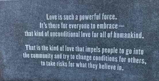 “The Embrace” is a bronze sculpture by the artist Hank Willis Thomas. It symbolizes the hug Dr. King and Coretta Scott King shared after Dr. King won the 1964 Nobel Peace Prize. The 19-ton bronze artwork was welded together in Washington state by the Walla Walla Foundry and transported to Boston where it now stands in Boston Common. “The Embrace is a testament to what we can achieve when we come together,” said Thomas. “The sculpture embodies people’s capacity for love, change and hope for the future.”
