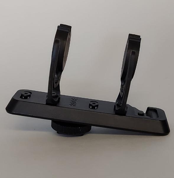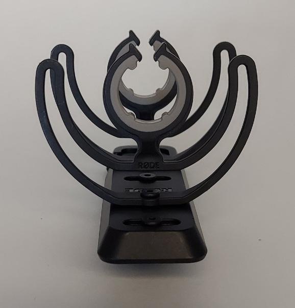 A suspension shockmount with camera shoe adaptor for mounting various RØDE microphones onto a cam-era via the standard hot/cold shoe mount.