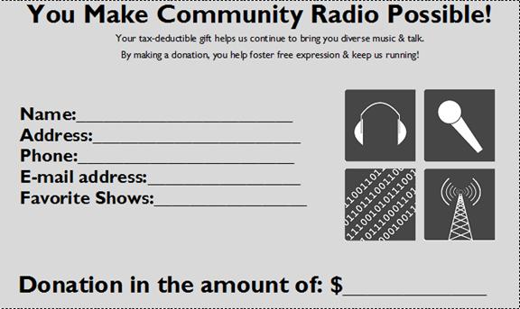 By making a donation to the stations or their programs, you help us keep community radio operating! Donations of goods or services may be tax deductible and we can offer you several things in return. You may choose to sponsor a show or help the station with new equipment. Contact the Director of Programming to find out how you can help.