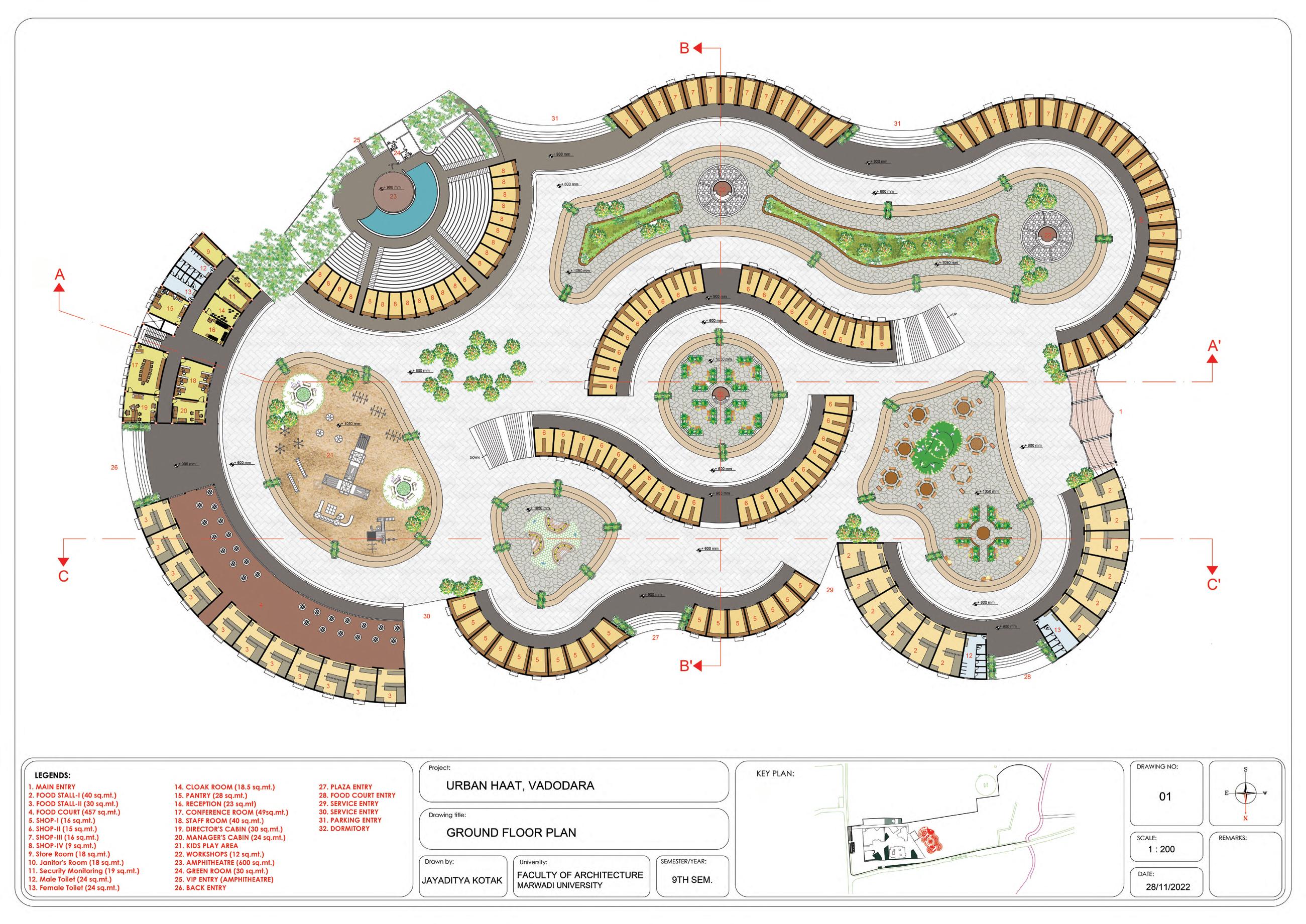 Studio brief: To design a URBAN HAAT for Gujarat tourism, Vadodara Muncipal Corporation (VMC) and Vadodara Urban Development Authority (VUDA). It provides an ambience of a traditional village market for contemprary needs. It provides a mix of craft, food and cultural activities.