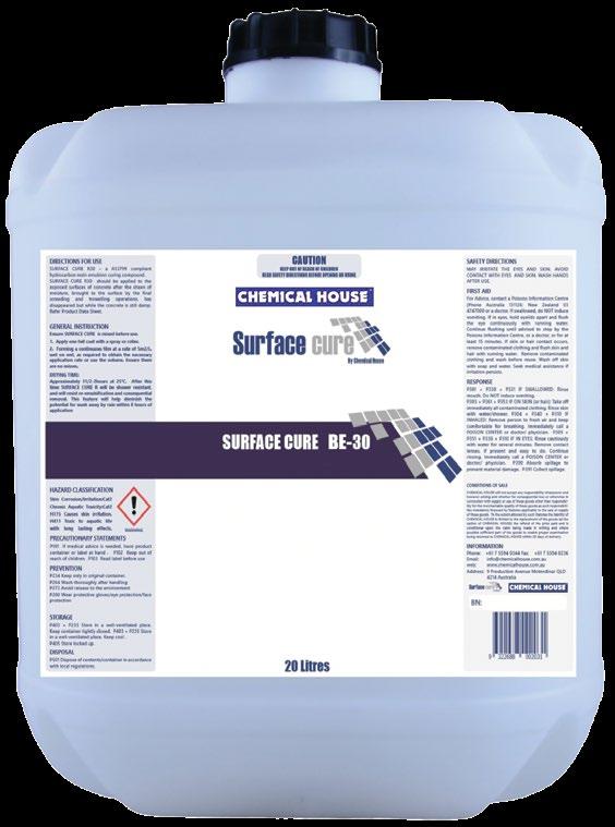 Surface Cure W30 is a low viscosity wax emulsion curing compound which consists of a processed blend of paraffin waxes. When applied at the recommended application rate Surface Cure W-30 minimiSes moisture loss in freshly laid concrete thus improving the curing of the concrete providing increased strength and durability and improved resistance to surface dusting.