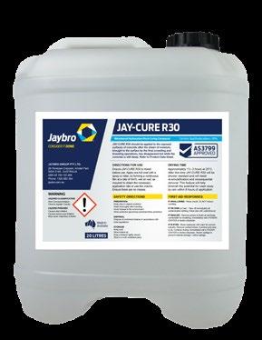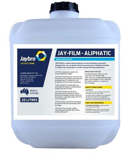 JAY-FILM will not normally interfere with subsequent toppings, tiling, render, surface coatings etc often used in industry. JAY-FILM is not considered to be a hazardous product. JAY-FILM is NOT a curing compound. Surface Cure R-30, W or BE are water based curing compounds complying with AS3799 are also approved by Main Roads QLD.