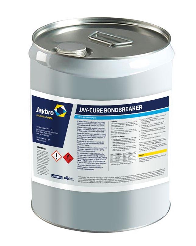 Jaycure Bondbreaker is a complex blend of solvents and naturally occurring long chain aliphatic acids, which form a gel when reacted with damp fresh concrete. Designed for use in prefabricated concrete structures, tilt-up panel construction, debonding new to old concrete members.
