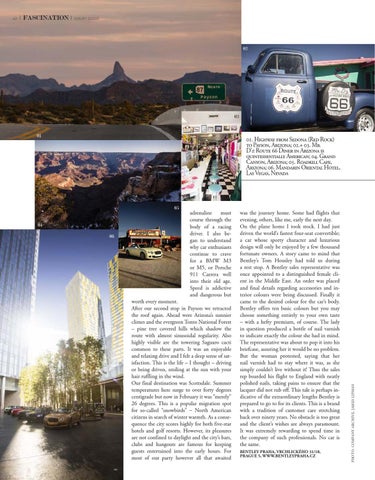 was the journey home. Some had flights that evening, others, like me, early the next day. On the plane home I took stock. I had just driven the world’s fastest four-seat convertible; a car whose sporty character and luxurious design will only be enjoyed by a few thousand fortunate owners. A story came to mind that Bentley’s Tom Housley had told us during a rest stop. A Bentley sales representative was once appointed to a distinguished female client in the Middle East. An order was placed and final details regarding accessories and interior colours were being discussed. Finally it came to the desired colour for the car’s body. Bentley offers ten basic colours but you may choose something entirely to your own taste – with a hefty premium, of course. The lady in question produced a bottle of nail varnish to indicate exactly the colour she had in mind. The representative was about to pop it into his briefcase, assuring her it would be no problem. But the woman protested, saying that her nail varnish had to stay where it was, as she simply couldn’t live without it! Thus the sales rep boarded his flight to England with neatly polished nails, taking pains to ensure that the lacquer did not rub off. This tale is perhaps indicative of the extraordinary lengths Bentley is prepared to go to for its clients. This is a brand with a tradition of customer care stretching back over ninety years. No obstacle is too great and the client’s wishes are always paramount. It was extremely rewarding to spend time in the company of such professionals. No car is the same. BENTLEY PRAHA, VRCHLICKÉHO 31/18, PRAGUE 5, WWW.BENTLEYPRAHA.CZ