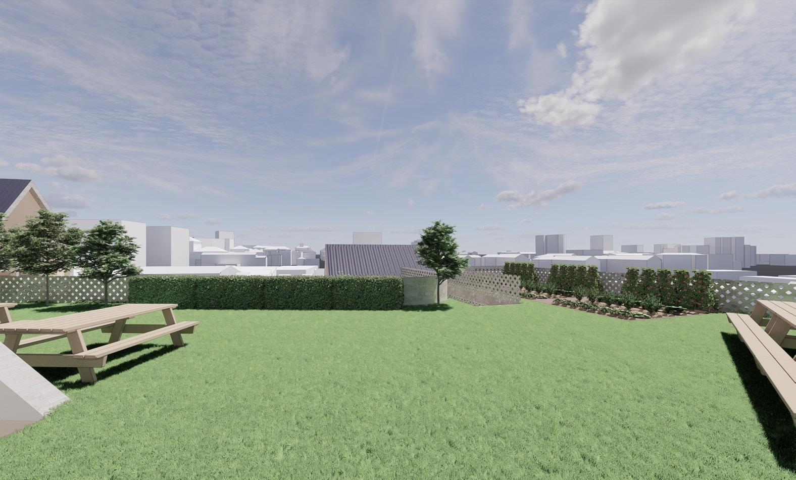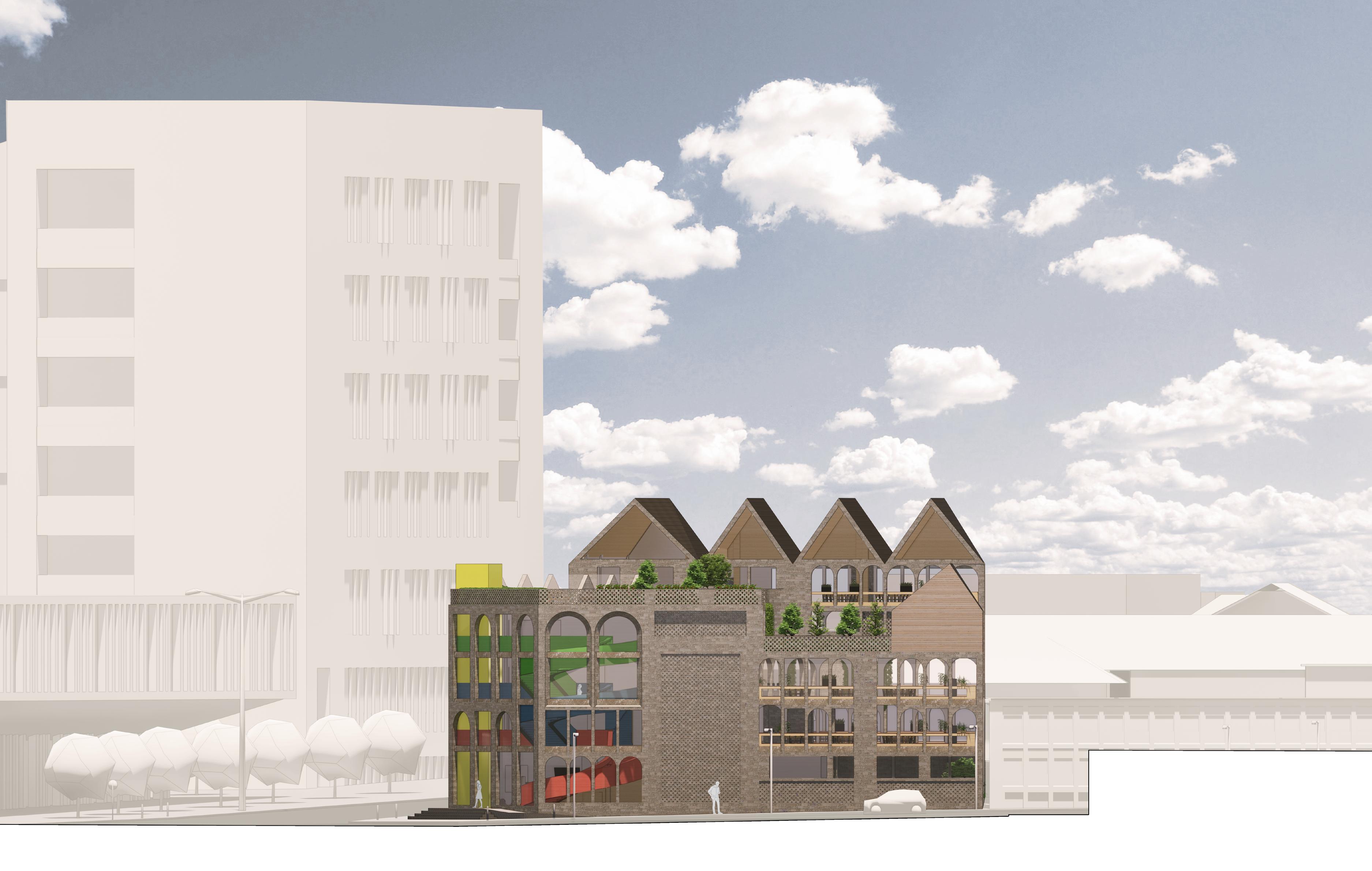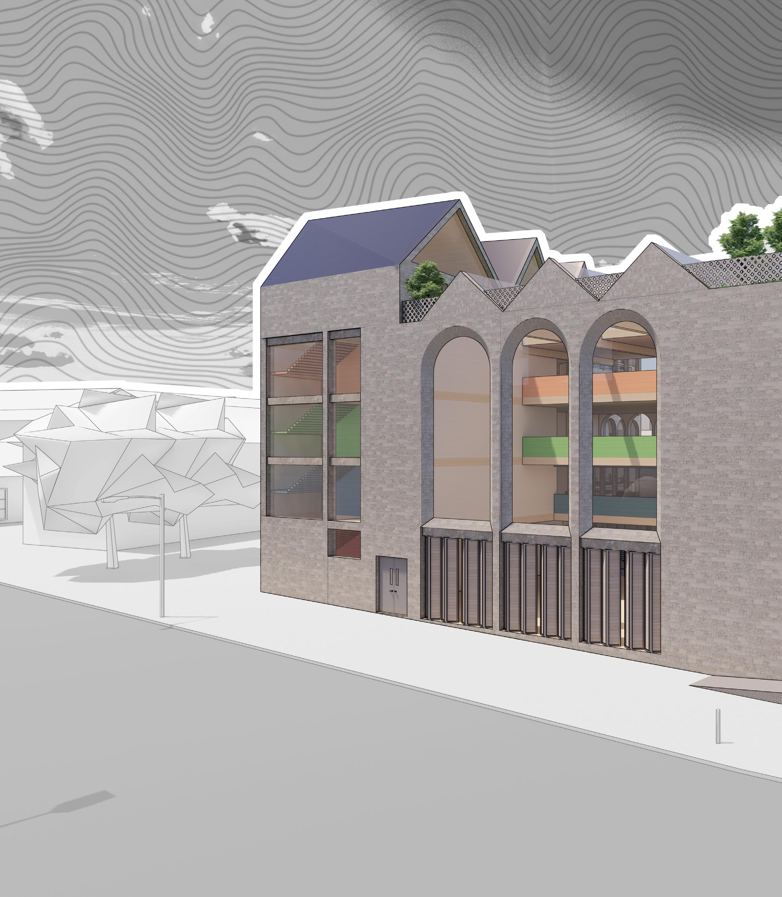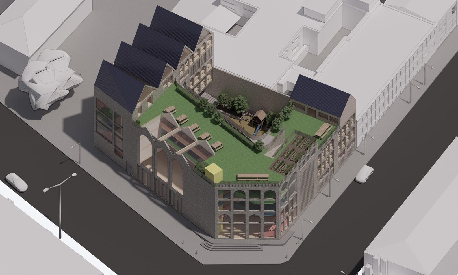 4 storeys high with a large amount of greenspace, promoting user wellbeing. Seating to enjoy the area and aid the communal element of programme. Open floor plan to the allow the childrena a space to run and play freely.