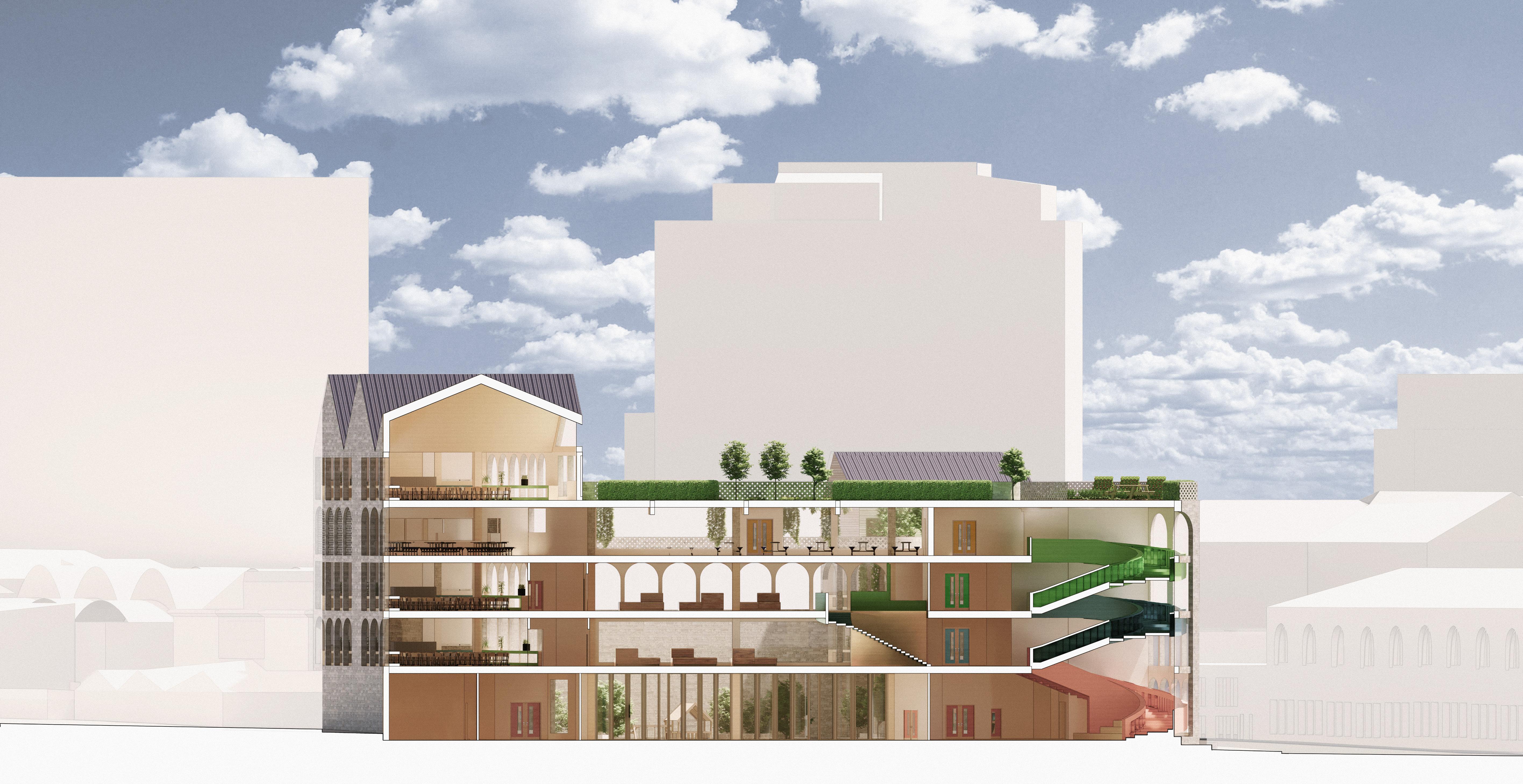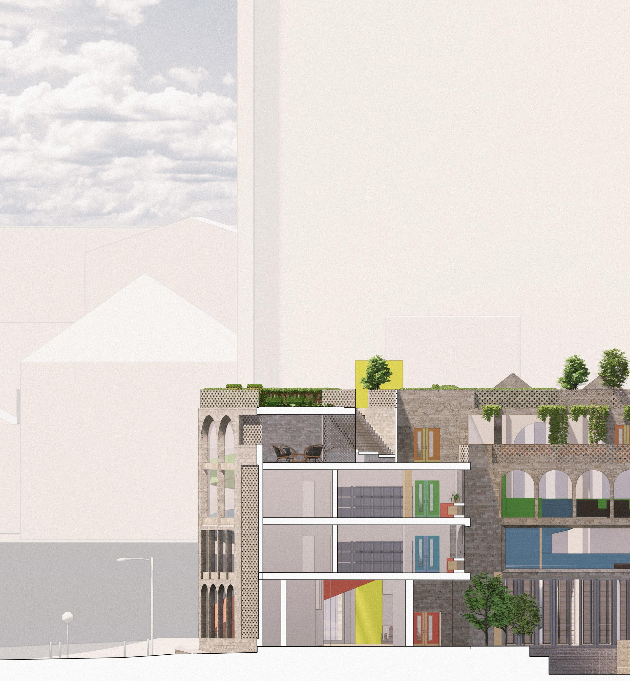 This view shows the aerial perspective of my proposal. From here you can see all the street-facing facades of the building as well as the greenroof terrace and the ground floor courtyard and how these spaces are lush with greenery and vegitation