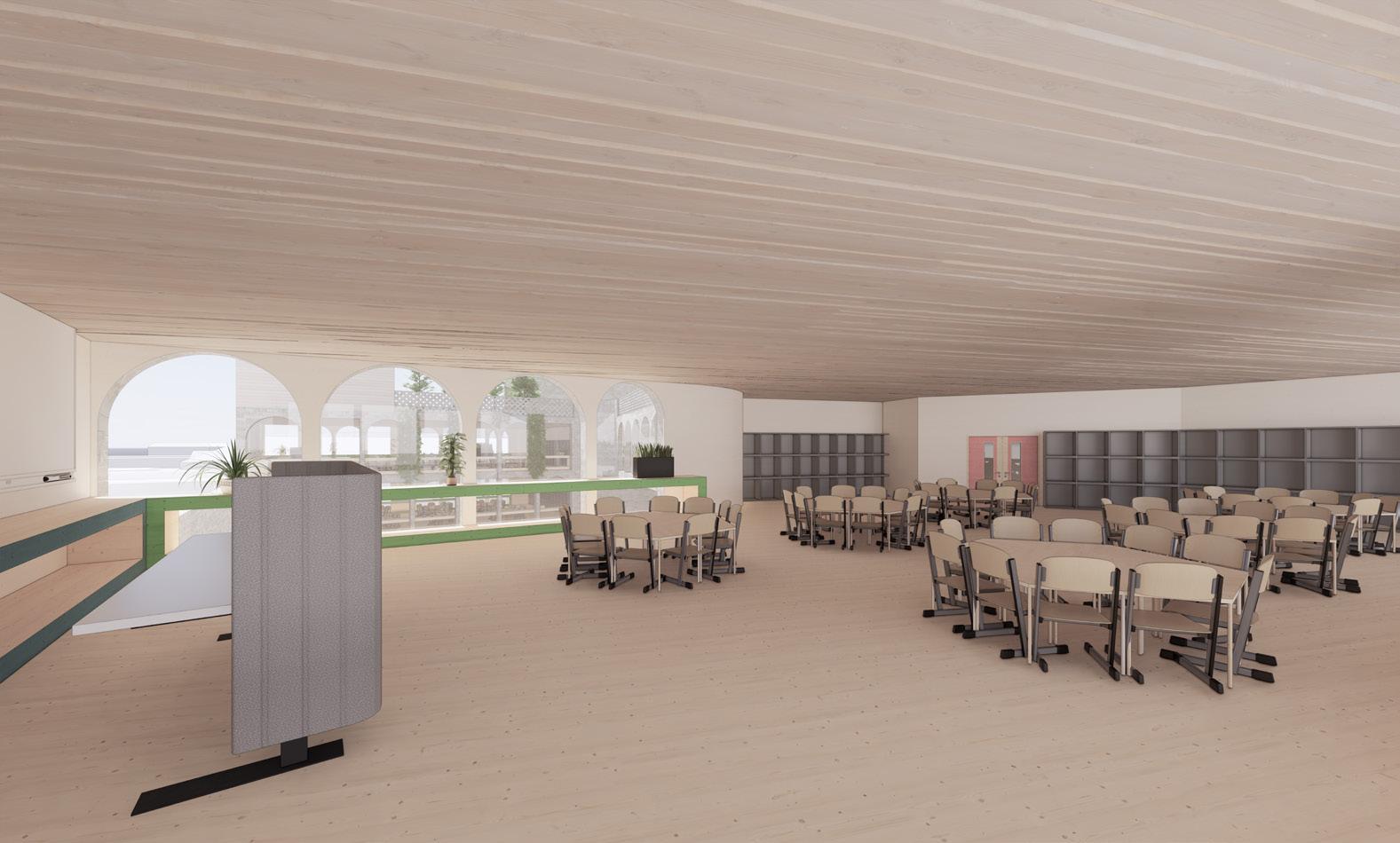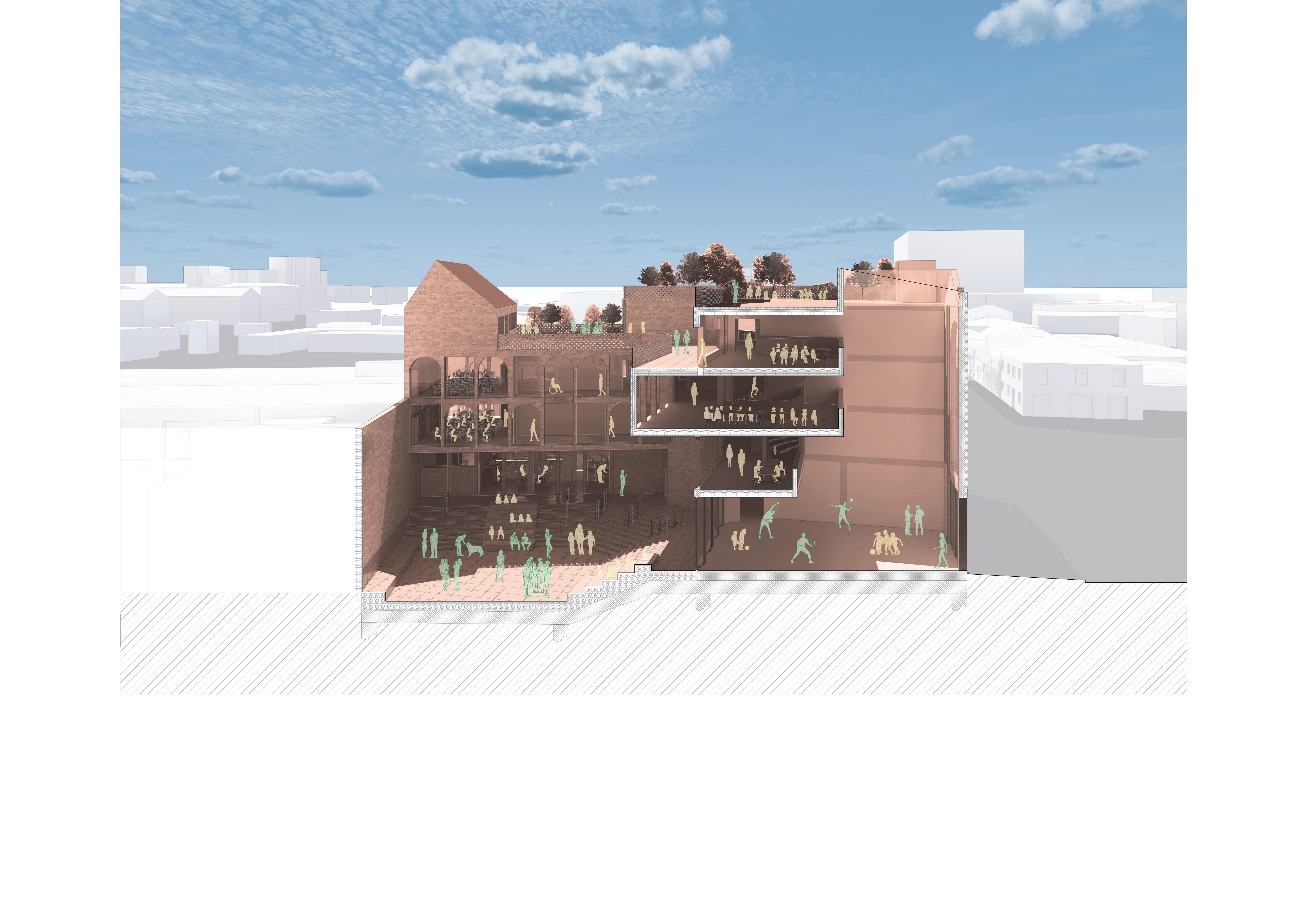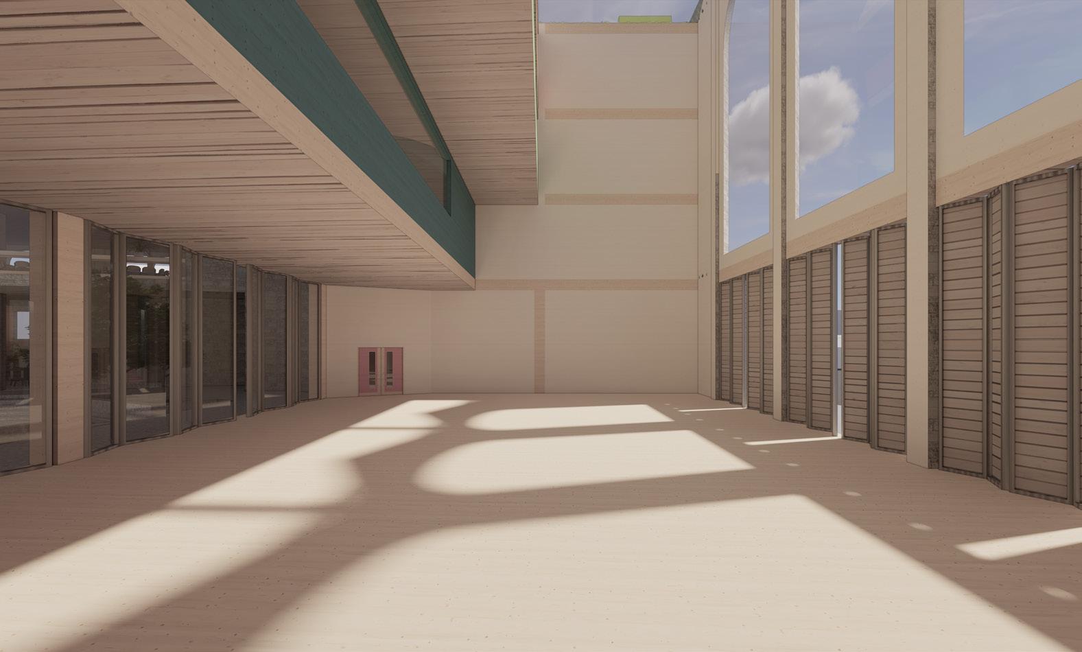 The multifunctional sports hall has Bifolding concertina doors that open to create direct circulation from the street, through the sports hall and into the courtyard to maximise the openness of the space and the desired communal atmosphere.