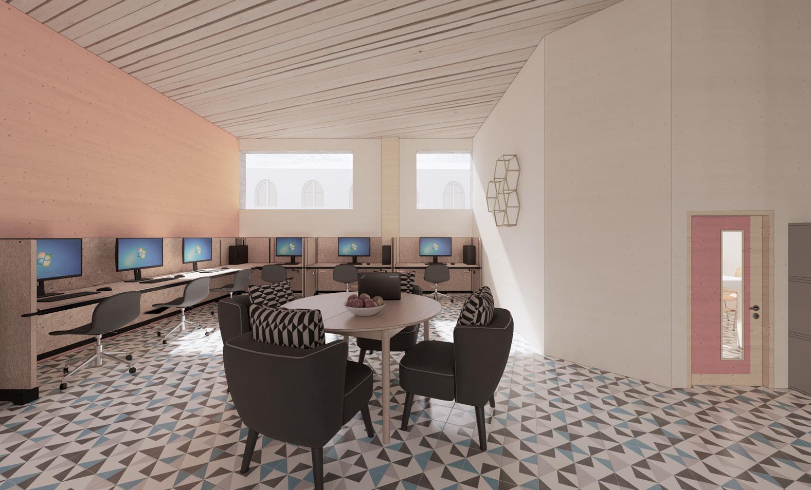 Space has high up windows to ensure enough privacy but sufficient daylight. Has nurse’s office and conference spaces. The materiality of the space uses carpet flooring, CLT walls and wooden slat ceiling.