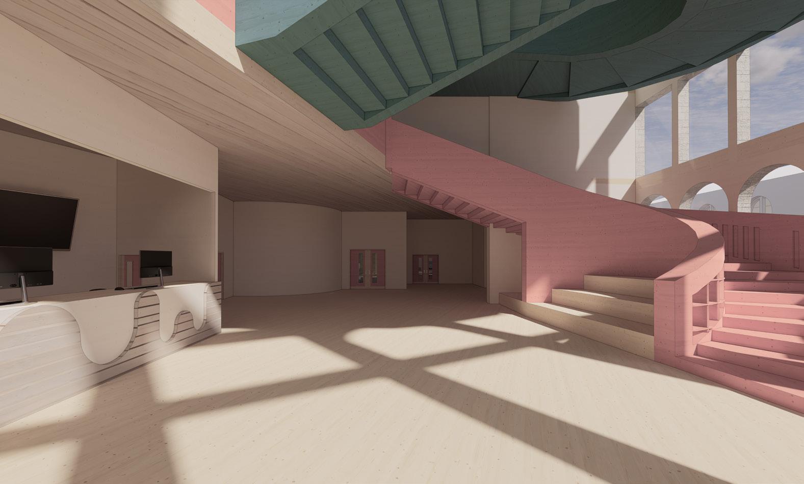 Big open entrance atrium with accented vibrant CLT staircase. Reception and staff rooms are situated such that they’re immediately accessible upon entry into the building for all users, students, staff and the wider community.