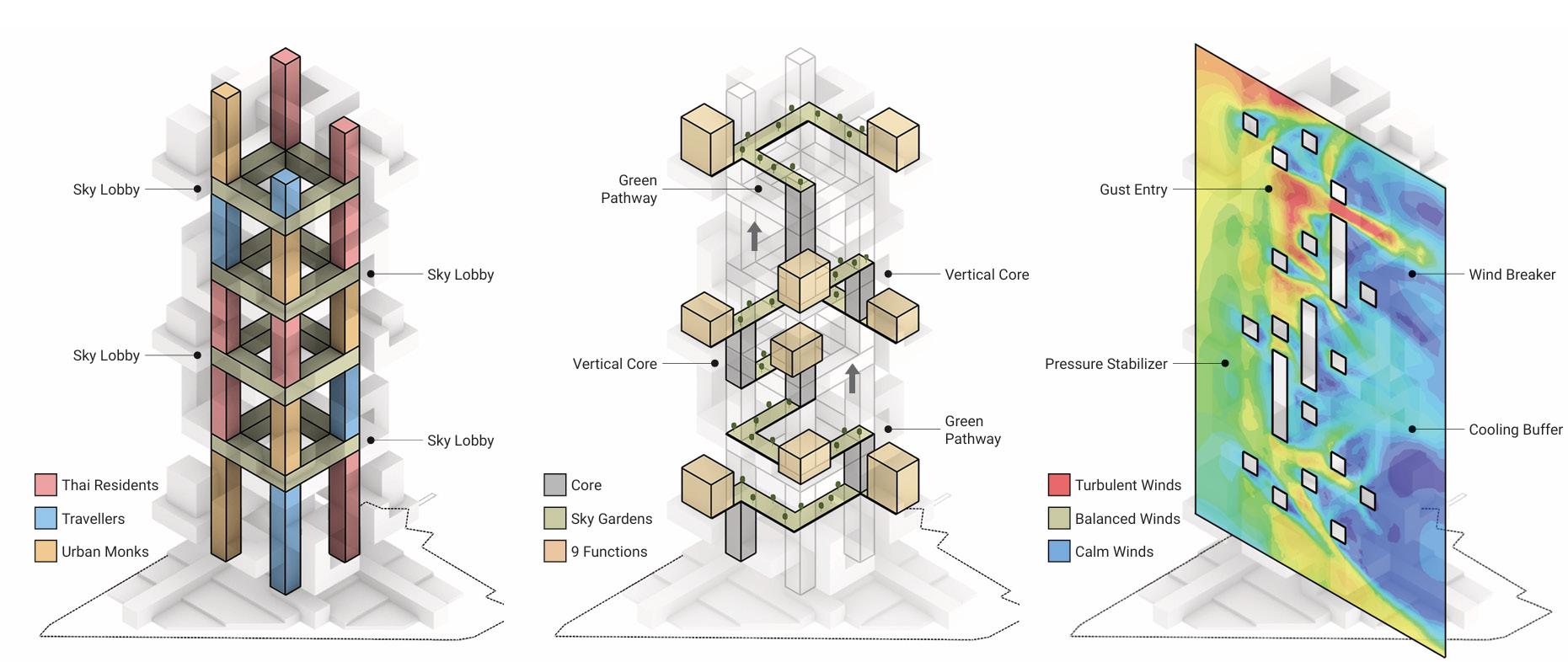 A high-rise in Bangkok inspired by Buddhist spirituality, designed to reconnect urban monks, spiritual travelers, and Thai residents. The project embodies interconnectedness and harmony, creating a sanctuary for meditation and community engagement. Blending tradition with modernity, it fosters spiritual restoration within the city’s dynamic urban landscape.