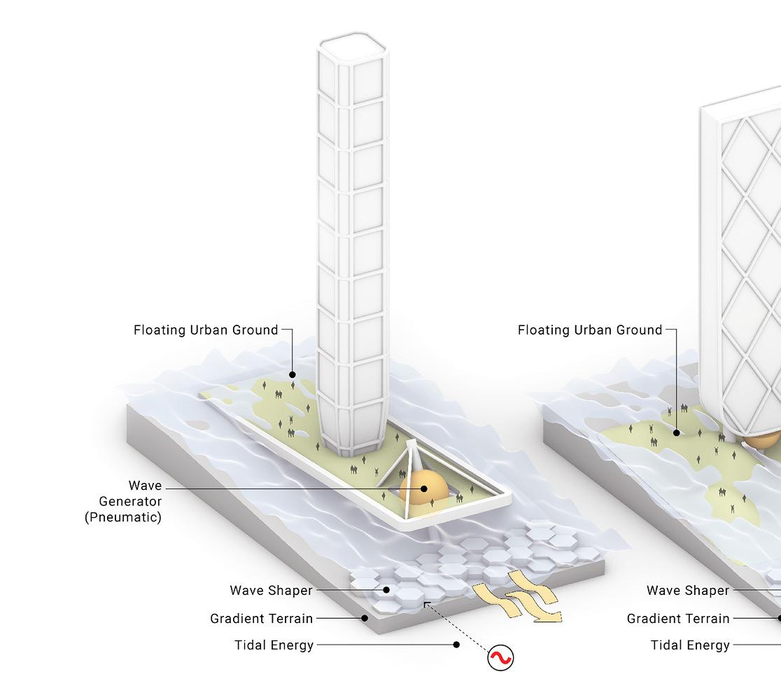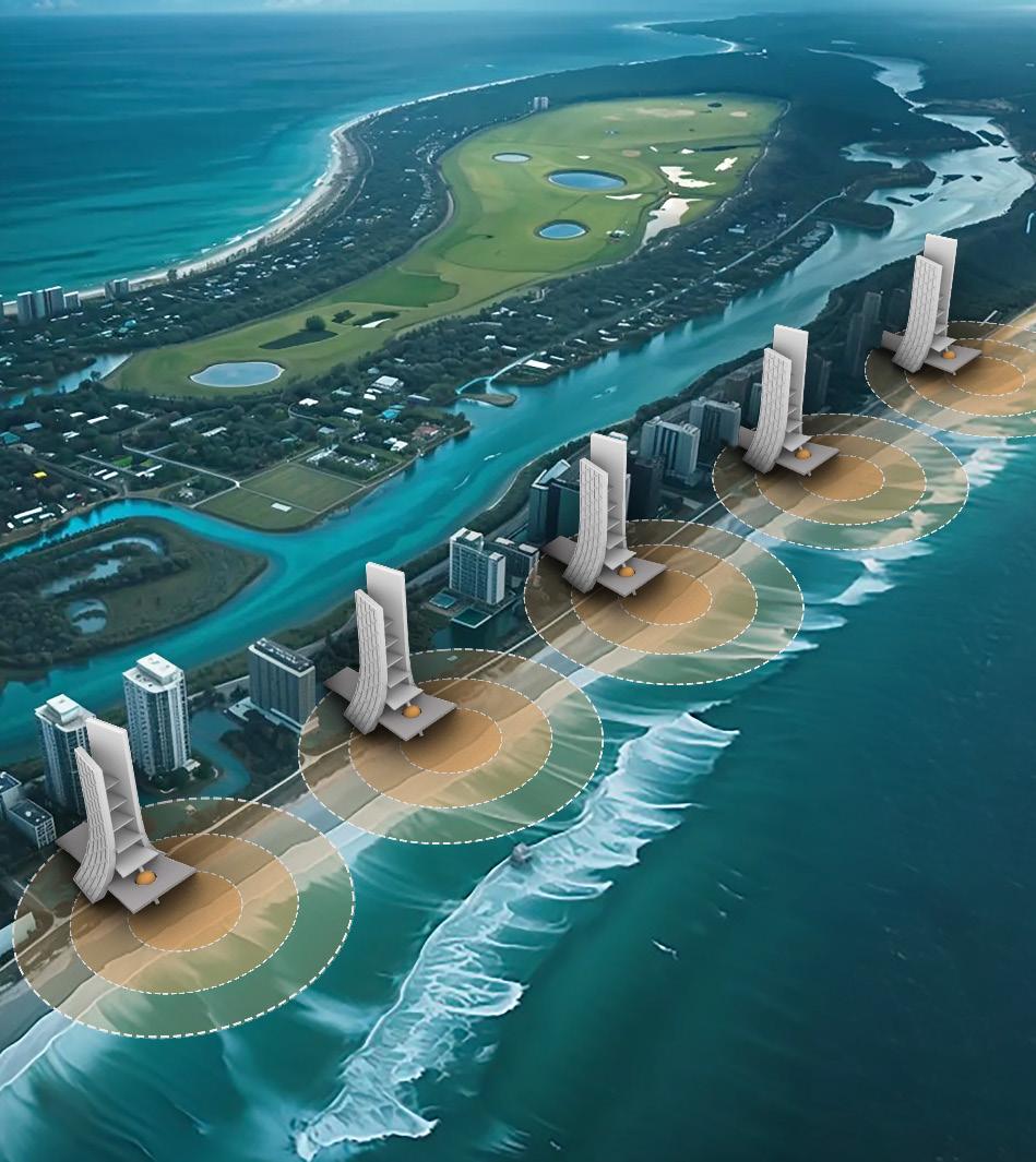 Miami is at high risk of survival due to increasing sea levels and intensifying hurricanes. Maximizing the limited land availability, reimagining the dead parking podiums of coastal high rises as wave mitigator, provides safe elevated grounds for future developments as well safeguards the low rise Miami. Thus, sustainable infrastructure multiplies the real estate value at prime locations.