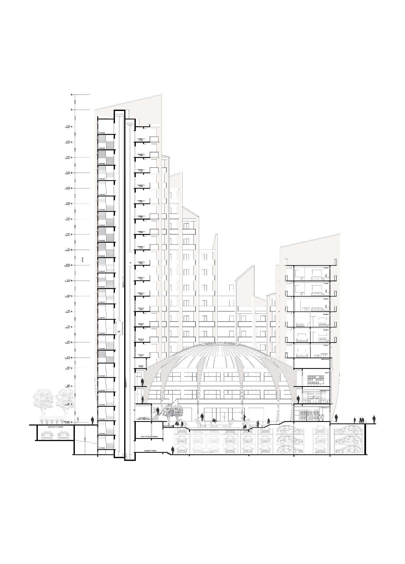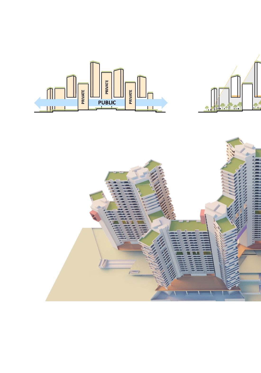 The project reimagines Mumbai’s isolated free-standing structures to be more interactive and collaboratively incorporates the urban realm into private projects by integrating an urban park over the dead parking volumes that. With a focus on accessibility, sustainability, and community engagement, the design strikes a balance with the needs of a growing urban population.